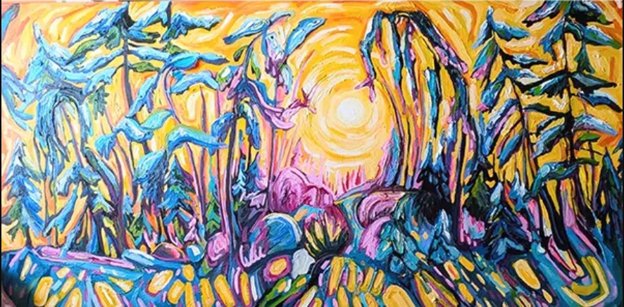 Montina Hussey, Whimsy Woods, mixed media on canvas, 108 x 48 inches