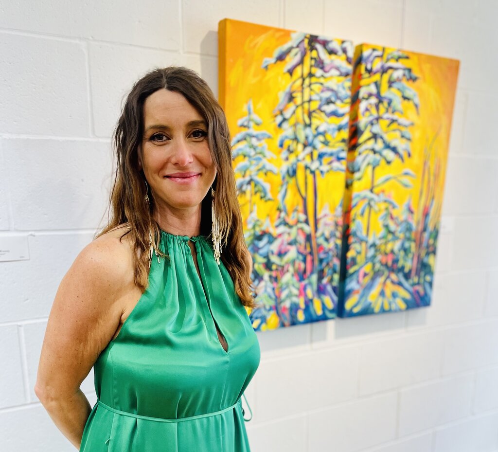 Montina Hussey in front of her painting Honey Skies, (Diptych), oil on canvas, 16 x 28 inches. Photo: Polyna Alexseev