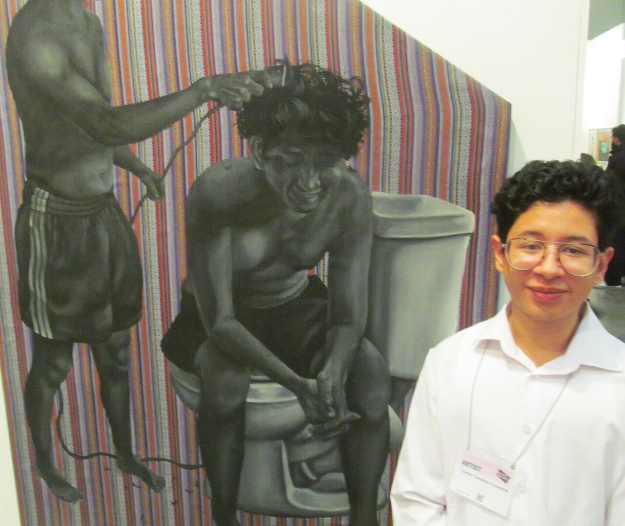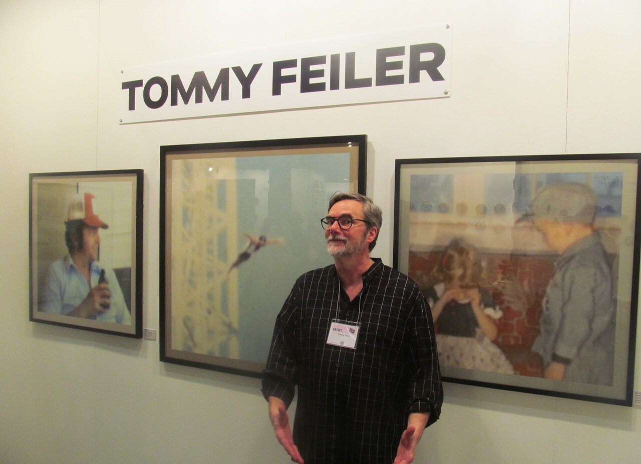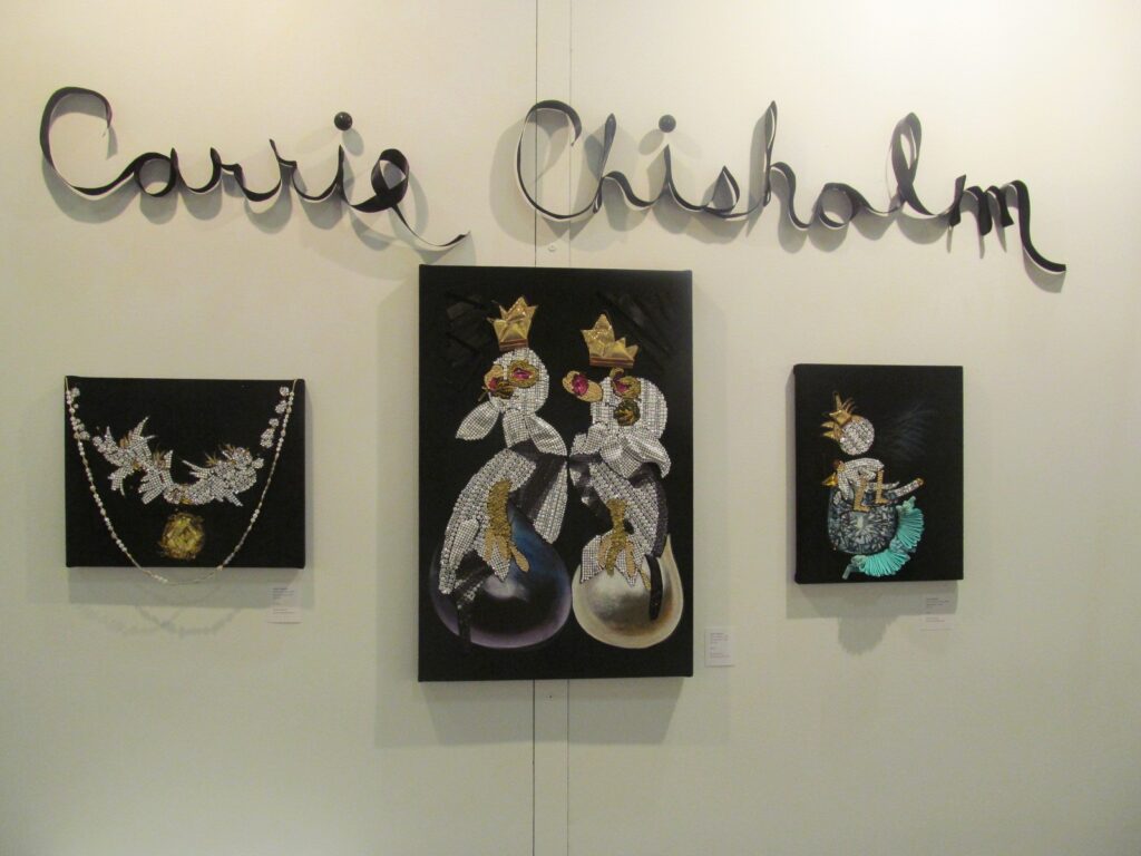 Artist, former architect Sanghoon Kang had participated in the Project last year and was back this year after a successful exhibit in Seoul, Korea. Painter, Rachel Sardella was new to the Project, displaying her abstract landscapes. Carrie Chisholm showed her mixed media work on a corner wall and was looking forward to exploring some of the 300 artist booths at the event. Her friends, artists Ross Bonfanti and Sandra Tarantino shared a booth and did collaborative works using a variety of materials. The works were playful and fun with pigeons and other creatures made of ceramics and cement.