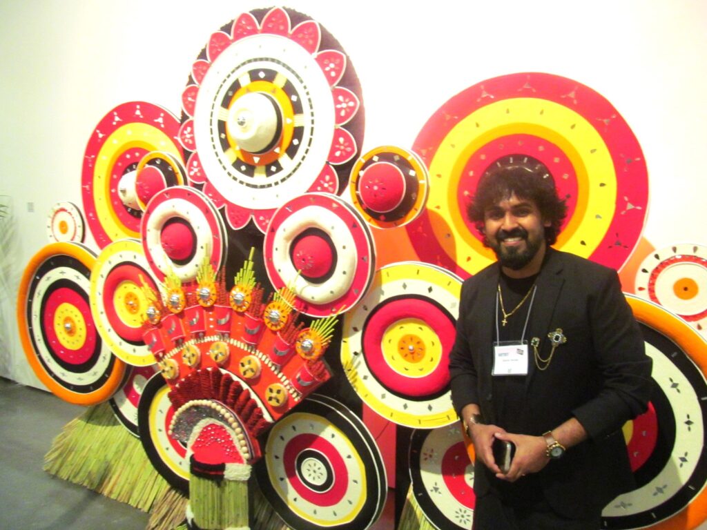 Alexander also highlighted that the bigger venue allowed the use of space to spread out installations and sculptural works. The colourful installation by Gabriel George Echoes of The Divine, Kerala India was inspired by the head gears of Theyyam, India. Though constructed of different material from Canada the artist’s aim was to reach many different cultures.