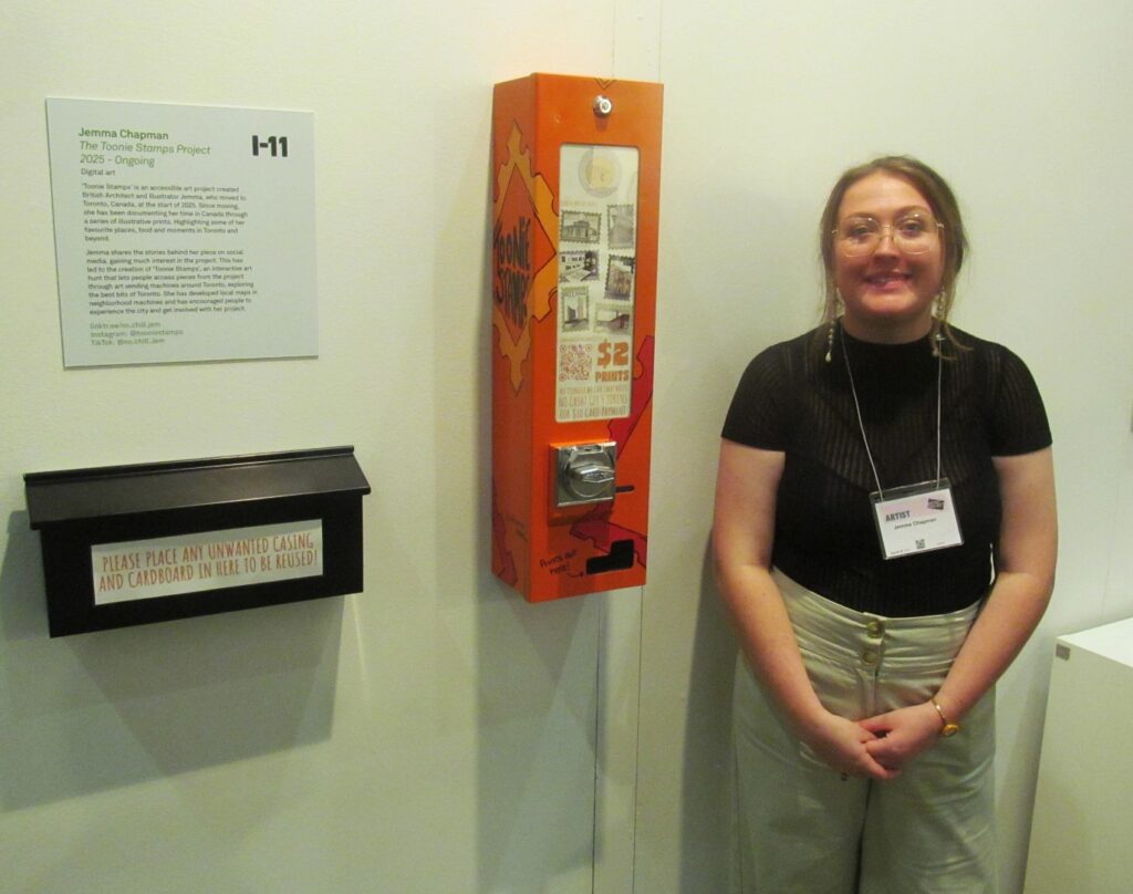 Jemma Chapman, a British architect, who arrived in Canada and wanted to tell stories of the many places she visited through an interactive work using digitally produced stamps. The Toonie Stamp Project was getting many curious visitors.