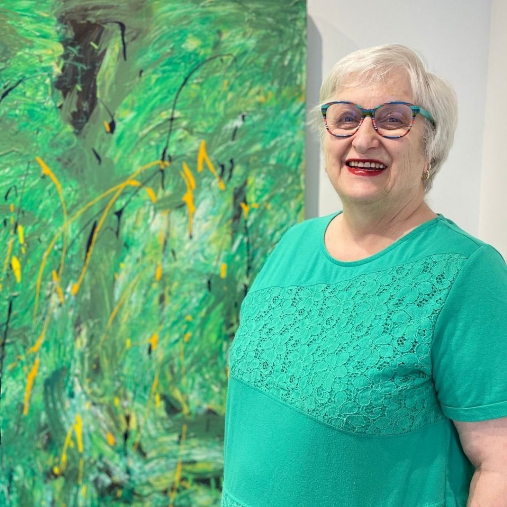 Gwen Tooth in front of her work at Propeller Art Gallery