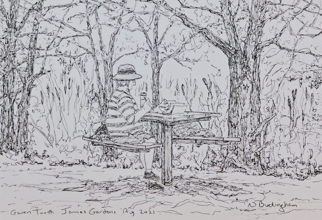 Nancy Buckingham, A Moment in Time with Gwen, ink on watercolor paper, 7 x 10 inches