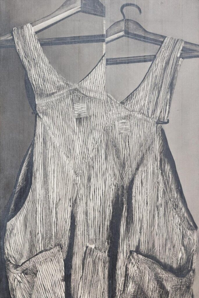It is surely within this hyperreality that Thompson’s practices are located. The images he selects from the internet interest him as images, simulations, and not as referents to the real. He is not simply depicting, for instance, the dress or overalls in Double Over, but rather he is focussed on construction of the image itself. Here he pushes cellophane onto the painted surface to simulate digital techniques, e.g., effects created in photoshop. His painting, therefore, makes visible the images as images. Were he to have used digital techniques directly, of course, their digitalness, so to speak, would be invisible to us, taken for granted.