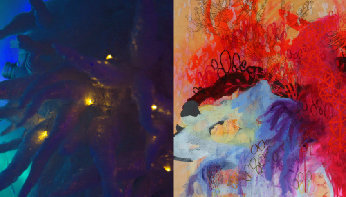 Harruthoonyan’s show takes us to a world of dream, surrounded by the cosmos, relaxing the mind. Then upstairs Mann’s exhibition greets the viewer with a world of ecstatic colors that energizes and activates the imagination. The two exhibitions greatly complement each other.
