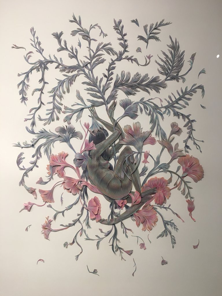 Truong has a total of eight spellbinding papercut works in the exhibition, each delivering their own sense of play in the form of collage-like entanglements. Secluded within plants, flowers and trees – Parasympathetic draws attention to feminine forms and celebrates whimsical exaggerations. Within the scenes of marsh and myth masked nymph characters are enveloped in their own fantasies and enchantment. Troung’s attention to details give a phantasmagoric visual experience, which transcends the viewer into colourful spirals of beguilement. Her work is delicately curious, and creates a moment of personal intimacy when hope is understood as a self-reflective moment between the individual and the land.