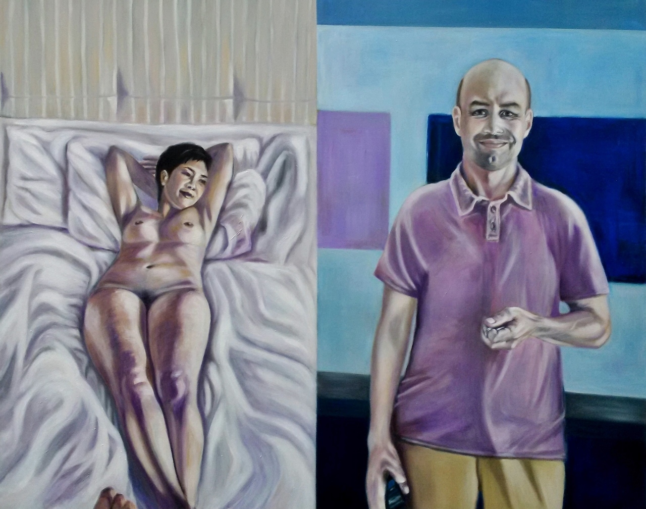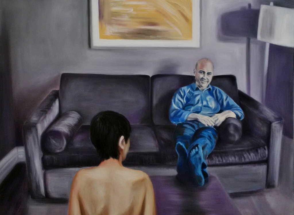 The two pieces in the exhibition from Dam’s Silent/Body Language series tell a story of a woman, presumably the artist herself, in the extremely vulnerable position of being nude in the presence of a fully dressed man whose gaze and smirk contain questionable intent. In The Comfortable Sofa, we only see the back of the woman’s bust and head, which comes across tense or rigid, while the male figure is relaxed and confident. This juxtaposition of body language suggests a hierarchy of power within the figures’ dynamic.