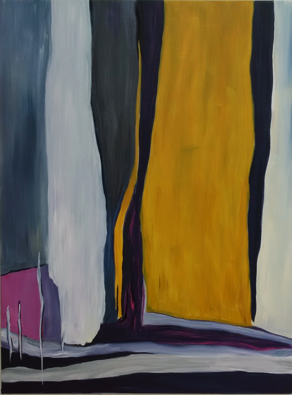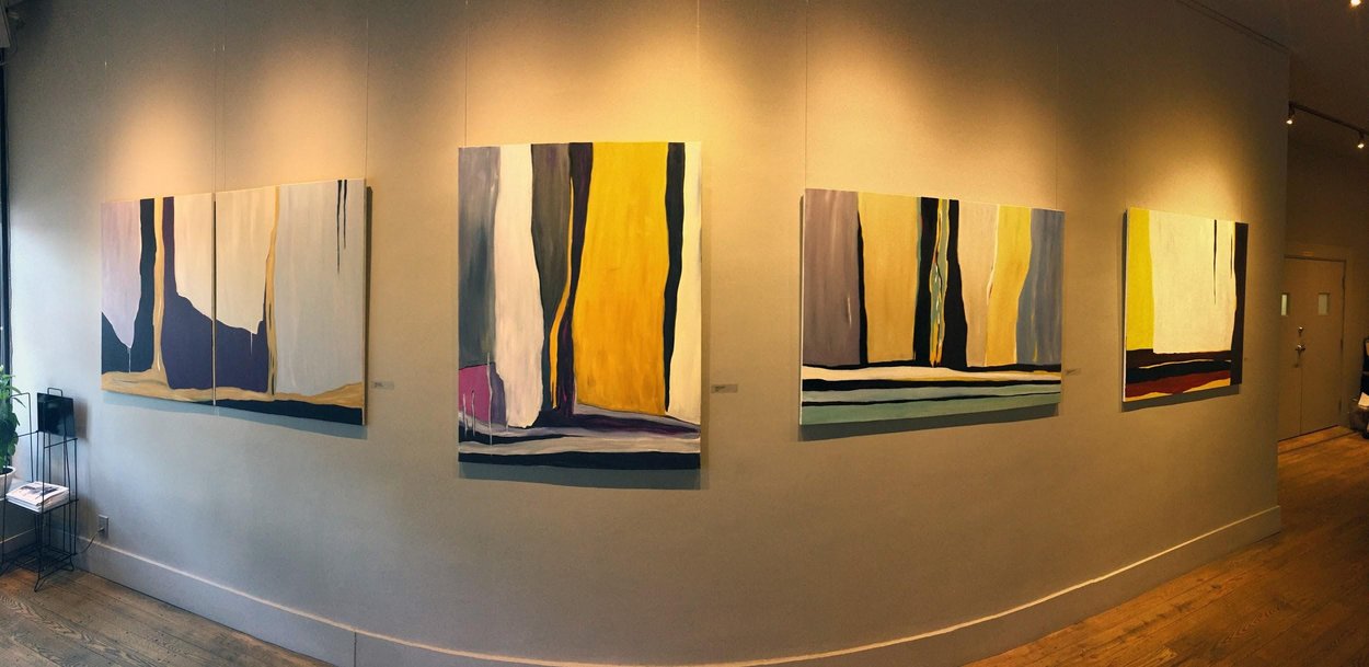 Titles for the work, such as Summer Rockies and Autumn Rockies, reveal to us the source imagery for the pieces and add a secret narrative to an otherwise strictly formal painting process and picture plane. Following those hints the works of wavy, vertical colour bands become a journey to mountain ranges and the sublime feelings these landmarks evoke.