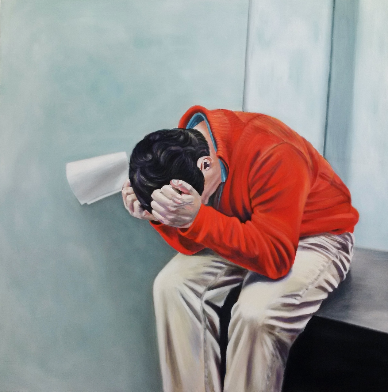 Most of the representational works are portraits. The one exception is French Lover, a still life, where the iconic perfume bottle is a stand-in for the elusive romantic partner the work is titled after. Many of the portraits are strikingly beautiful and confrontational, with the subject’s gaze directed towards the viewer. However, amidst these are a few exceptions, such as the same nude figure in two works from the artist’s series Silent/Body Language as well as the character within the work titled The Paper. In The Paper, the figure is hunched over and visibly in distress, presumably caused by the crumpled piece of paper held in his hand. The ambiguity of this document dramatically affects how to read the work. The contents could be anything from a failing grade to a serious medical diagnosis or eviction, and the narrative seems to focus on this emotional state. This use of symbolism with other recognizable visual motifs, to express sentiment and affect the viewer, are prominent in many of the Dam’s representational works.