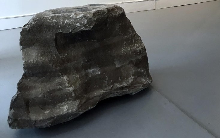 These dualities continue throughout Wihak’s work since the simulated textures of the drawing are in fact flat and relatively textureless. The simulation and the real become distinct through our haptic senses, despite the uncanny visual perception. Further contrast is found by placing the real rocks within the gallery context. Conventionally, these objects are perceived as sculptural elements meant for aesthetic considerations and therefore the codes and conventions of the white cube gallery suggest that they are not to be interacted with, however, the artist’s intention was utilitarian. Wihak invites the audience to use the stones as benches to sit on while engaging with the art on the walls. Offering this vantage point for the work aids in the artist’s concept of blurring the haptic phenomenon with the visual simulation.