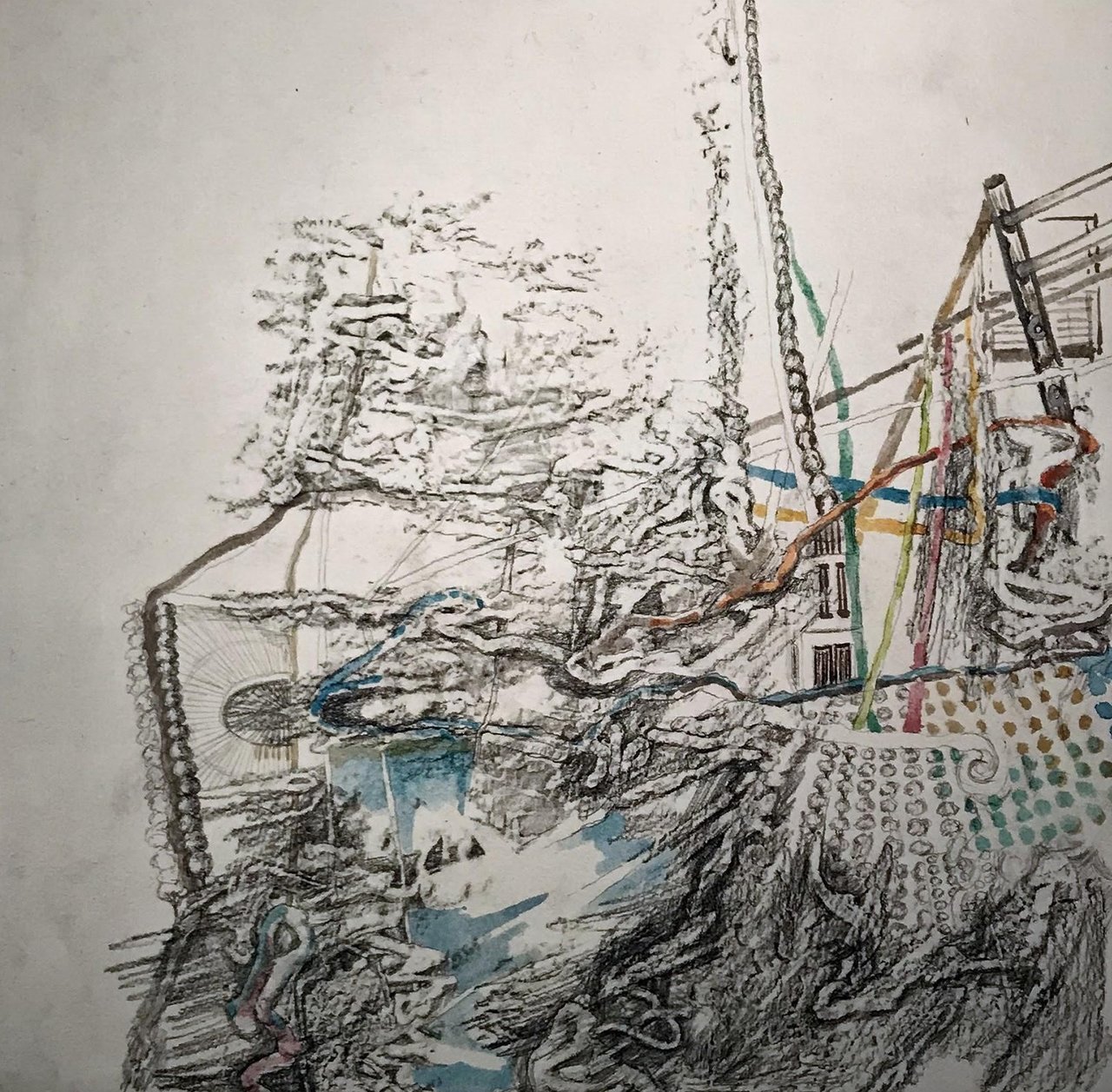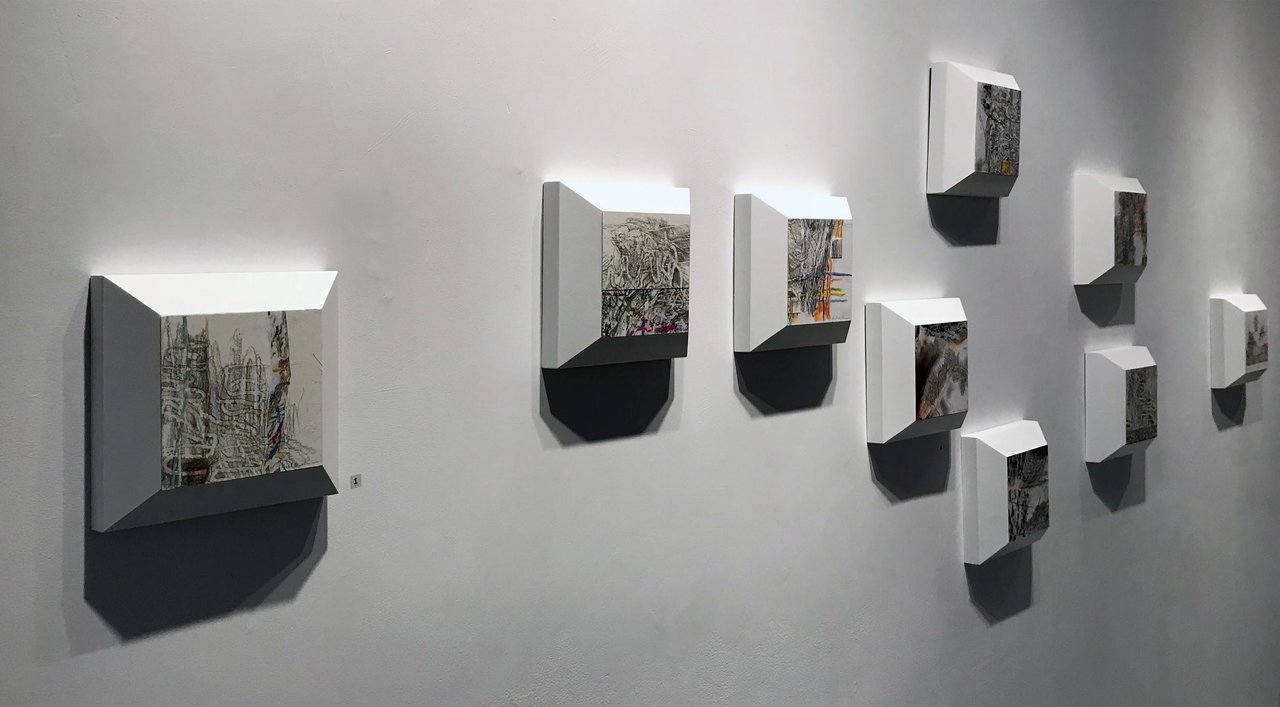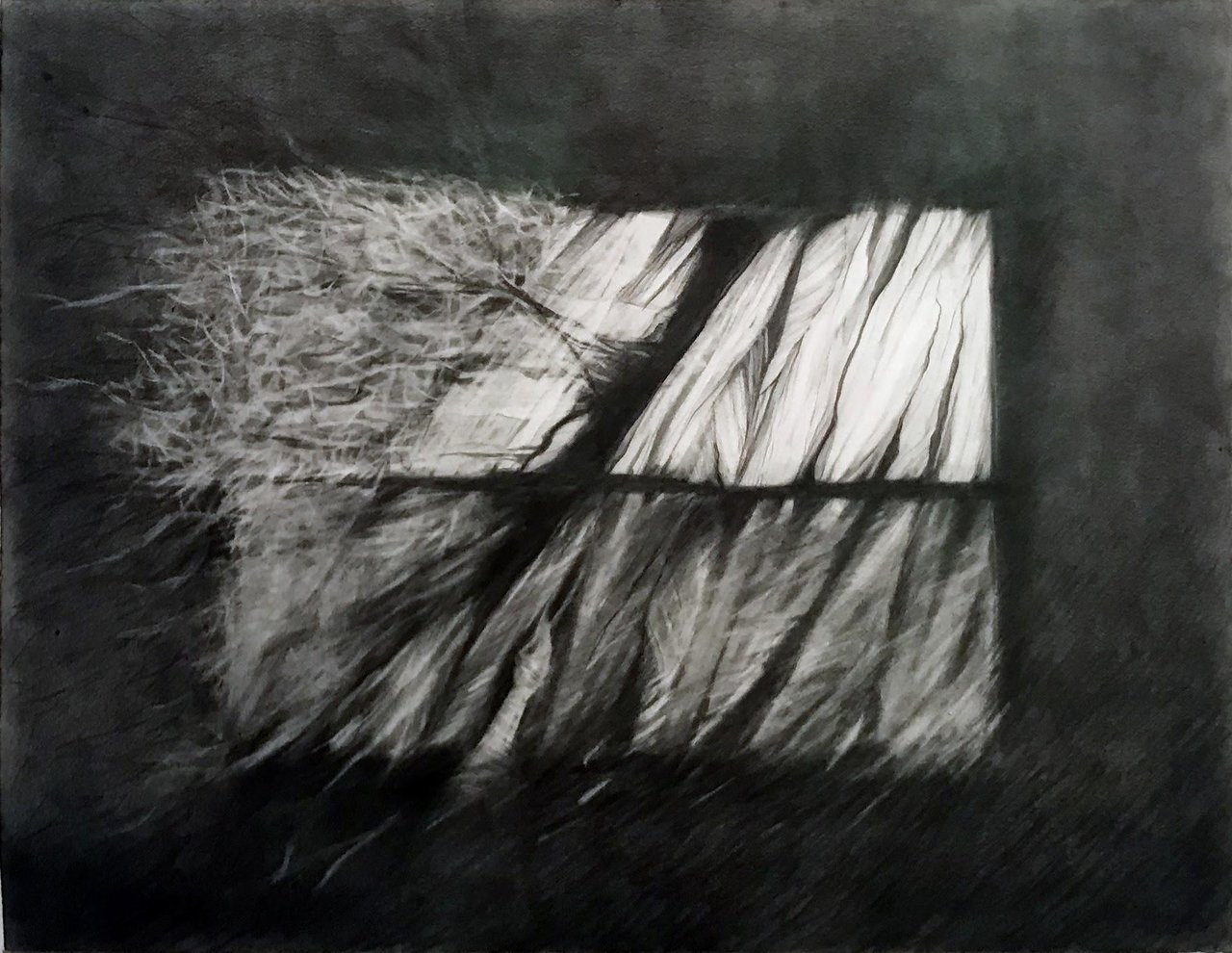 The second half of the gallery is dedicated to exhibiting The Wormwood Series by Yael Brotman. Frottage is the term used in image making when you rub paper with a drawing medium over a surface to produce a relief like depiction of the texture underneath. Brotman has utilized this technique as a foundation for her artworks. Using the patterns formed from woodworm infestations burrowing through trees, the artist converts these winding patterns woven into the fabric of the wood onto paper using graphite. From this starting point, Brotman utilizes several techniques, such as watercolour, transferring processes and collage to reassemble the drawings while she also adds realist details of man-made structures to enrich the image.