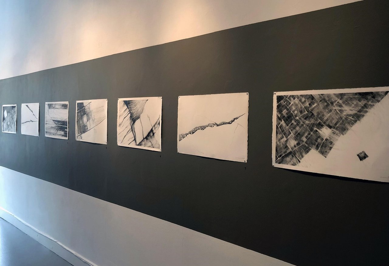 On the opposite wall, we have a series of graphite work titled and numbered Rupture, Slide and Fissure. Additionally, there are three large rocks with relatively flat tops stationed in the centre of the gallery to accompany the work. The drawings are uniform, unframed and placed against a large black stripe of wall. Their contents are renderings of geological phenomenon, however, there is a tension between the pieces – as to whether the scale is micro or macro. What could be a crack in a rock simultaneously could be an aerial view of a canyon, or what appears to be a flyover view of fields, may, in fact, be tiny patterns formed on the ground. The completely unsaturated palette of the greyscale drawings and slate coloured rocks create a juxtaposition against the more colourful Archipelago painting that faces it.