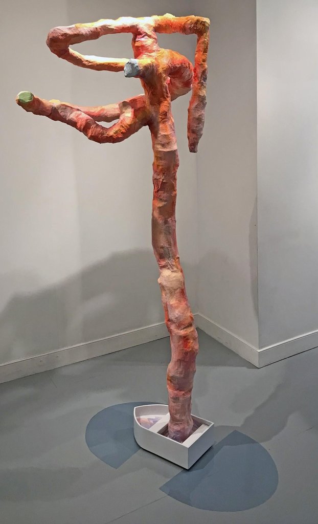 In the gallery, there is also one of Brotman’s sculptures titled Worm’s Progress. It is a large, neon orange, tube-like shape that branches off and twists towards the ceiling. Situated at its base, is a small white boat and two pieces of clear blue plastic that seems to suggest water. The work feels completely aligned with the rest of her series, except that it has manifested itself 3-dimensionally instead of on paper. The wormwood tunnel has become inverted to be a filled in tree-like statue, while the scale of the piece has been expanded to surreal heights.