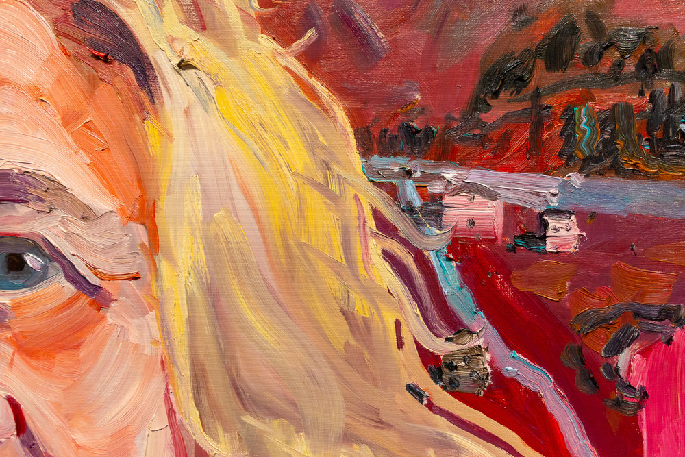 Once he has finalized the composition the colours are applied. He paints in oils with energetic and expressive brushwork. He starts at the top of the canvas and works his way down, painting wet-on-wet allowing the colours to blend with the brushstrokes. Using the same colour palette in the figure and the background establishes a visual connection between the two. He’ll adjust tone and colour in the background to ensure there is always a clear edge between the figure and the landscape.