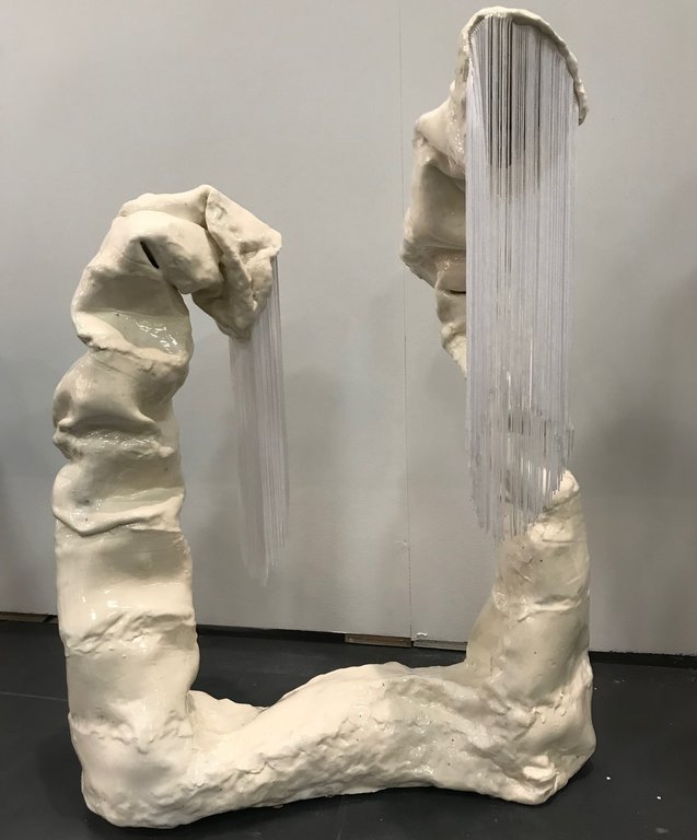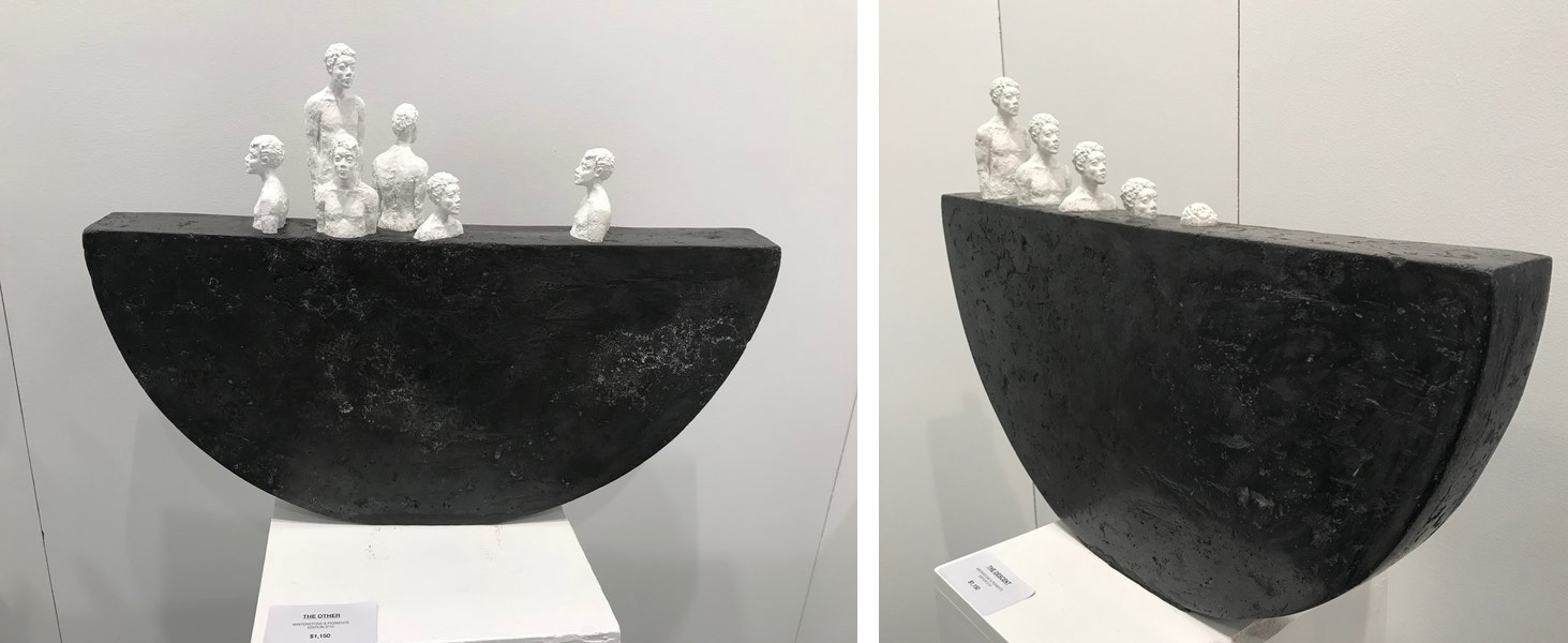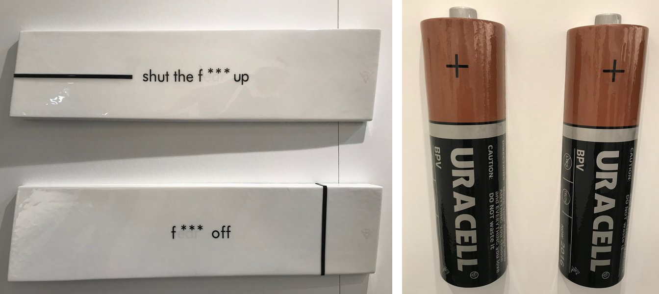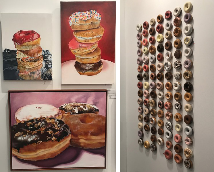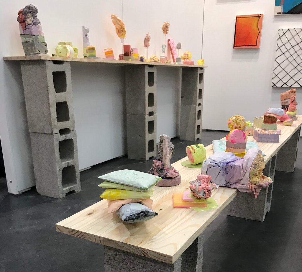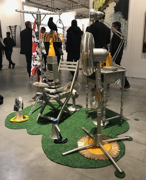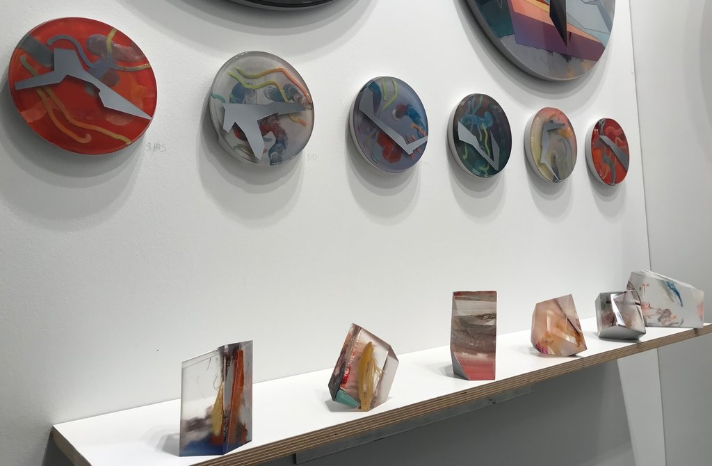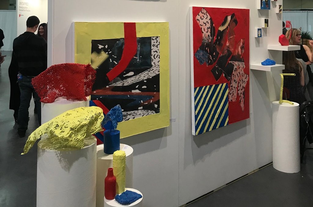 In the UNTAPPED Emerging Artist section, there were several brilliantly creative exhibitors. The work by Allana Cooper was particularly engaging. She uses the same wax and primary colours in both her sculptural and wall mounted pieces. The colours seem to elude to early childhood since primary colours are so readily used in kindergarten classes. The wax also feels youthful since it is soft and mushy like Playdough. When you take these elements and apply them to liquor bottles and sharp industrial materials like metal mesh screens, you get a tension between innocence and harsh environments.