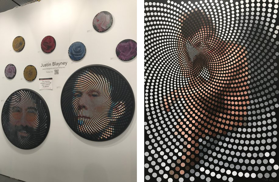 Justin Blayney uses mathematics to create paintings of dots in cyclical spirals that toy with our perception. When looking directly at the work with the naked eye, the dots are colourful and at best vaguely reveal a blurred image. However, when looked through a camera the rescaling of the paintings immediately reveals the picture within the work. A wonderful use of digital optics/the cyborg’s gaze to engage audiences with a clearly defined revelation and satisfying moment. The work that I felt fully utilized this technique was Blayney’s painting of a nude male sitting down with his legs crossed, staring directly at the viewer. This work seemed to parallel the technical exercise of revealing a hidden space, with the subject’s vulnerability of being naked, while simultaneously confronting the viewer.