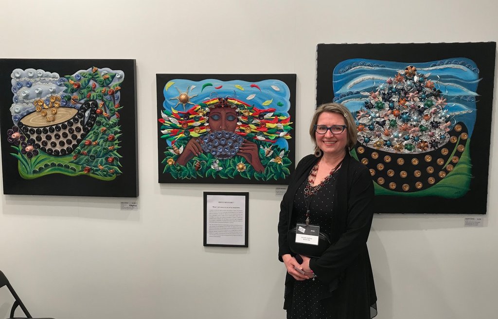 Inspired by the colourful aluminum of Nespresso coffee pods and a dissatisfaction with producing unnecessary garbage, Annette Gaffney has incorporated these common household objects into a series of work that beautifully depicts coffee cups and plantations in picturesque ways. The pods add a 3D aspect to the paintings as well as a reflective quality that rarifies the colours towards a more jewel toned palette.