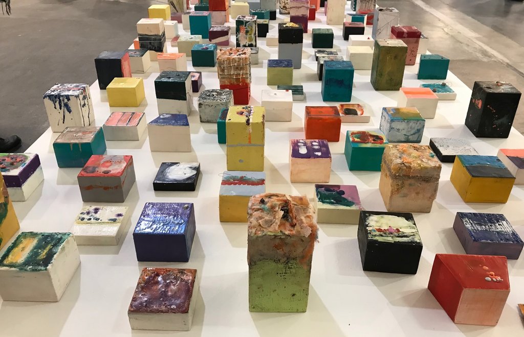 Mirrors of Colour (2018) by Dania Al-Obaidi is a collection of wooden blocks painted with encaustic wax. The installation is intended to act as a self-reflective experiment in which your attraction to particular objects – based on their colour or story – is revealing some ambiguous aspect of your hidden personality.