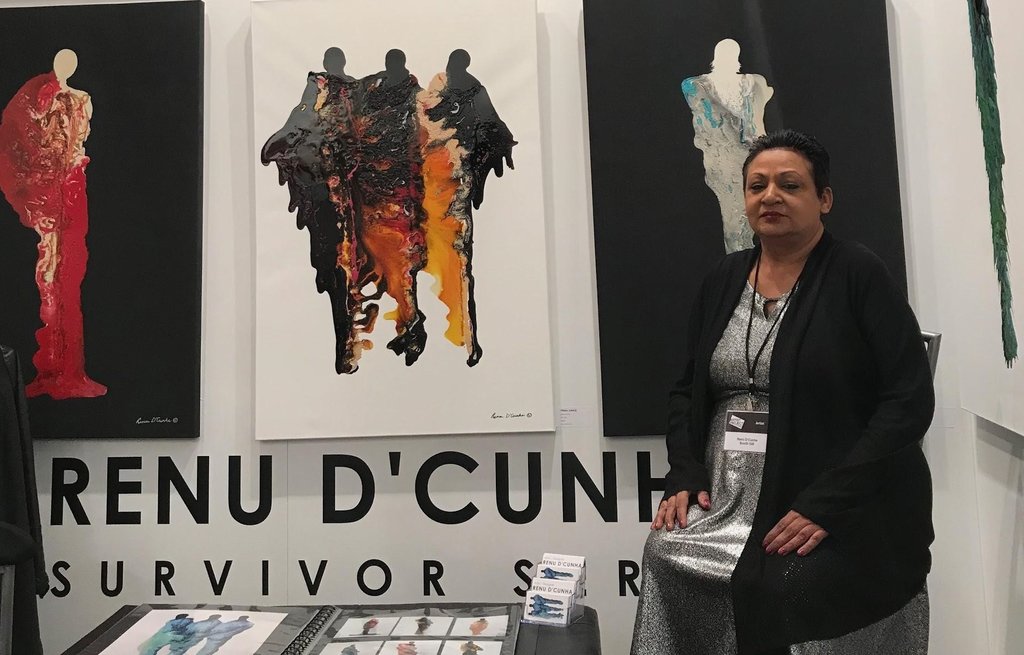 Through the manipulation of glass pouring mediums on canvases, Renu D’Cunha has shifted the usually abstract formations of the medium towards figurative representation. Pouring mediums are commonly used as an art therapy practice. D’Cunha, who was a watercolorist, discovered this new artistic practice after surviving cancer and a stroke, as she wanted to depict the soulful energy inside of herself and her family. The result is the Survivor Series, a huge collection of beautiful, vibrant and glossy forms that are skillfully manipulated using nothing but gravity and the occasional toothpick.