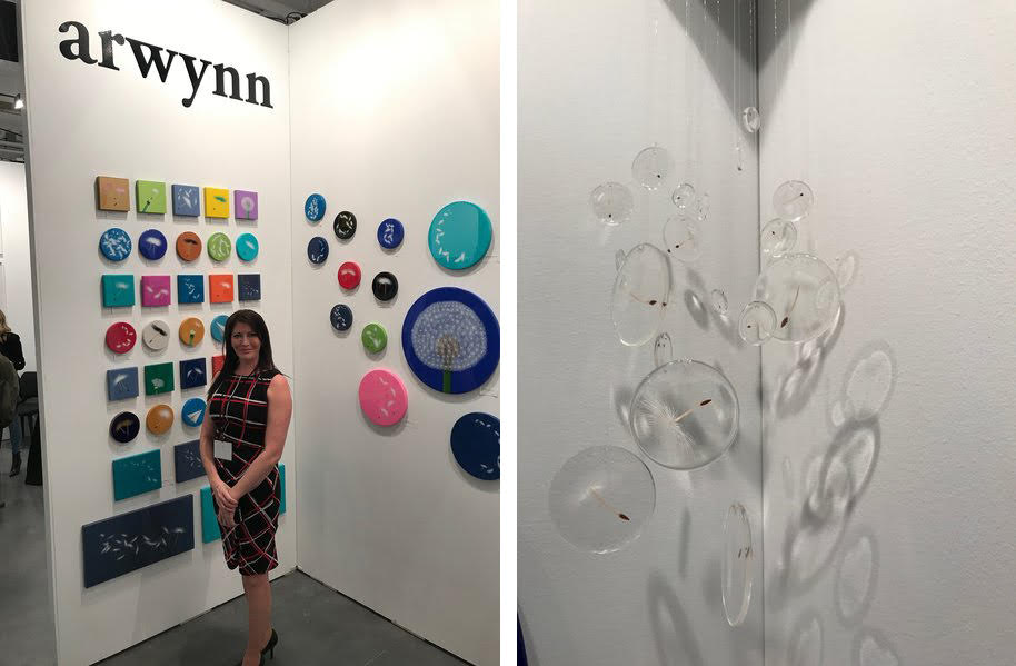 After becoming a mother, Arwynn Davey got attracted to the seed head of the dandelion flower. Whether it was seeing her son’s joyful exuberance when he would play with the plant by blowing its seeds into the wind, or the symbolism of reproduction and sending your offspring into the world, or even the cultural belief that dandelions can send your thoughts and dreams to your loved ones – Davey was fixated with the seed. Through her exploration she created a brilliant and unpretentious collection of work, all centralized on the dandelion. Her work includes several small-scale paintings, larger circular canvases and even a mobile/wind-chime that encases her paintings of seeds in clear resin. The work demonstrates how a common thing like a flower can generate lovely artworks that supplement its charm through its simplicity.