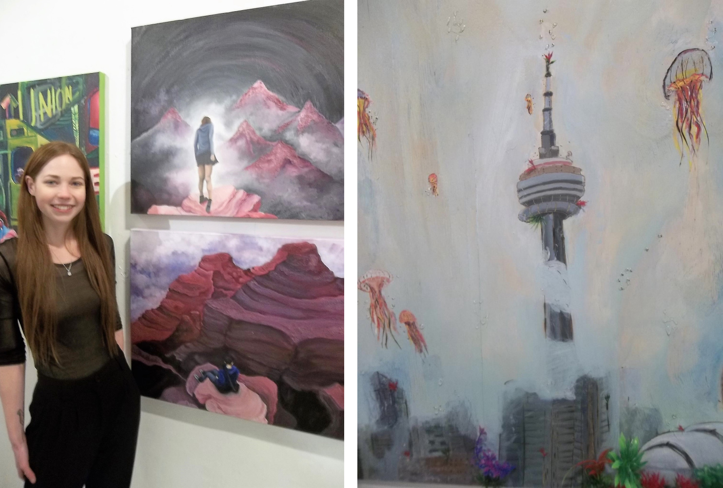Lesel Picou’s painting New Atlantis is an acrylic work on plywood, with the CN Tower is the center, as a vision of the future, under a mass of water surrounded by jellyfish. Like Picou Mollia Weidman takes us into unknown places, real or imagined, creating a dark and thoughtful atmosphere.