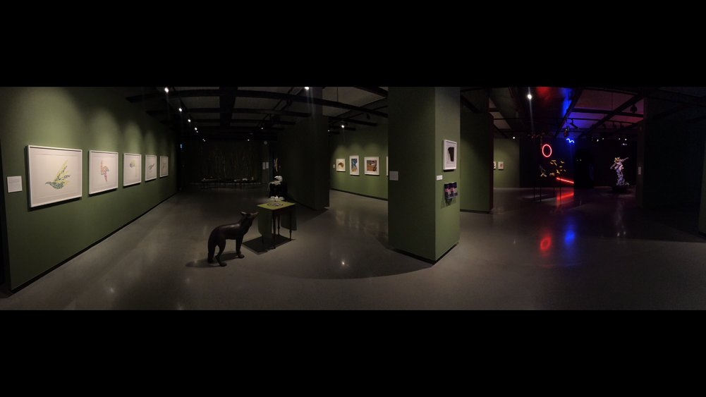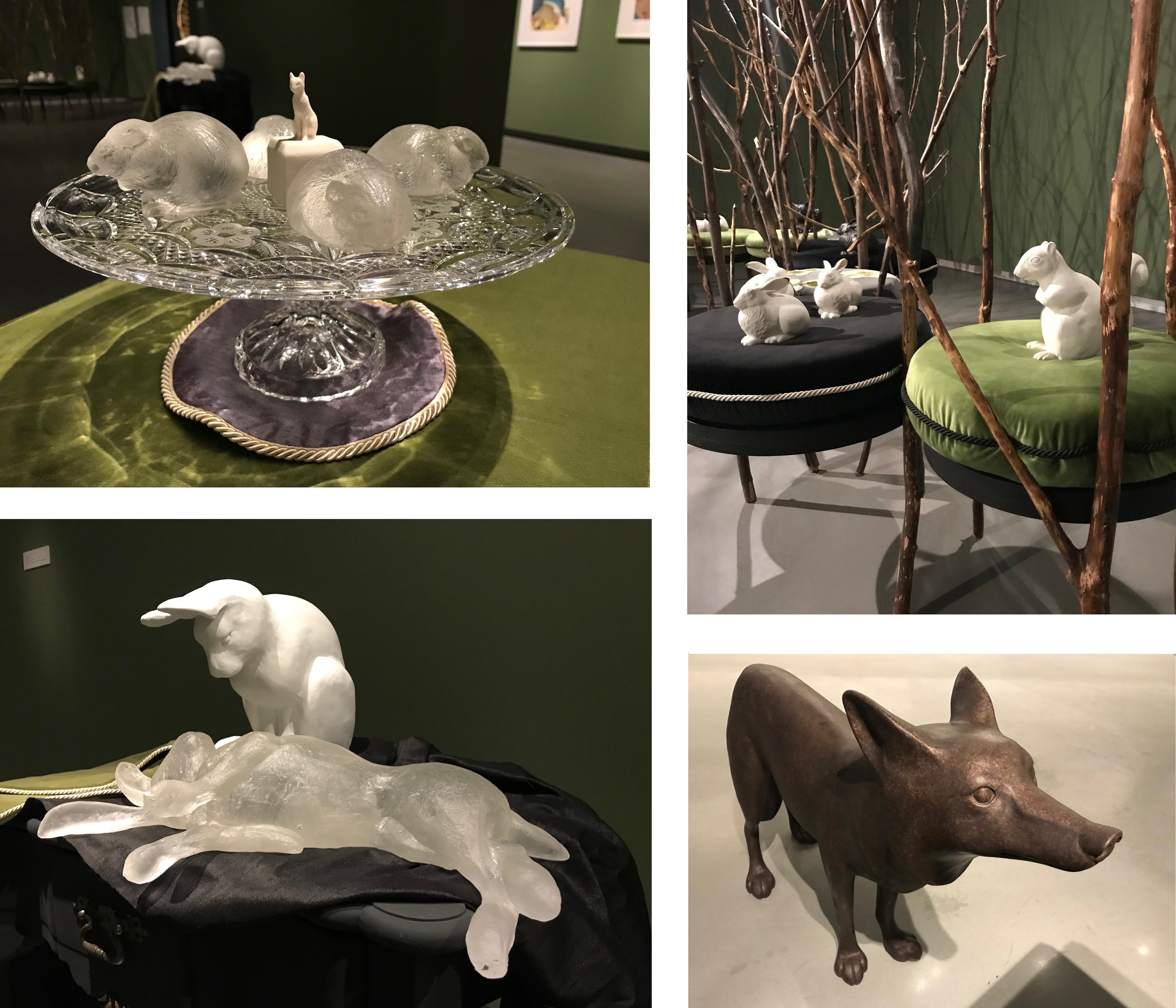 Mary Anne Barkhouse, Treats for Coyotes places sculptures of animals, indigenous to the area and the greater Boreal forests, juxtaposed against European colonial interior décor. The work speaks directly about the influence of colonial settlers on the habitats of Canada. When the settlers took the lands from the Indigenous peoples, they abandoned the forms of land stewardship in favour of the European tradition of domination. The work also addresses how certain creatures have found ways to adapt and thrive in the man-made world. Animals such as the urban coyote, coywolf and raccoons now live and thrive alongside us in cities and towns, having lost or foregone their natural habitats in favour of ours. The work seems to celebrate the resilience of animals to adapt to the unnatural world we have imposed on them, while simultaneously hinting at a darker truth that we have forever altered the ecological path of these species. Whether you see the installation as an idyllic scene from a Disney movie, where animals and people are in perfect harmony or a struggle to heal, there is an undeniable beauty and craftsmanship in Barkhouse’s pieces.