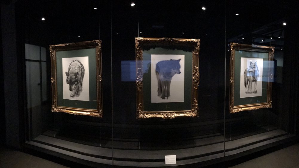 Elsewhere in the gallery, Barkhouse also exhibits three portraits of wolves in elegant bronze frames. The frames are traditionally used to hold paintings of royalty, a deliberate choice to try to depict the regal quality and status of these wolves. Within the wolf pack hierarchy, these three animals would be considered the king, queen and another sovereign figure.