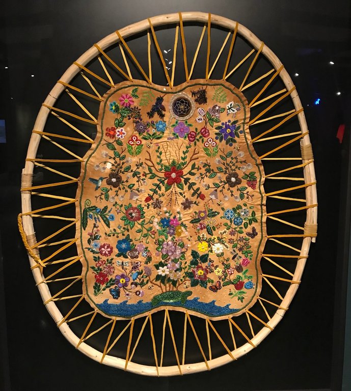 The single piece by Flora Wesistche in the gallery is a beaded tapestry of Caribou hide. The work depicts the Indigenous creation story of life spawning from the back of a sea turtle. The story behind the work is one of sustainability. When the artist’s father noticed the decline in caribou populations, he swore he would stop hunting and passed on this last hide to his daughter. The work’s story also involves the power of dreams, where listening and being in tune with the sleeping world can be creative and hopeful.