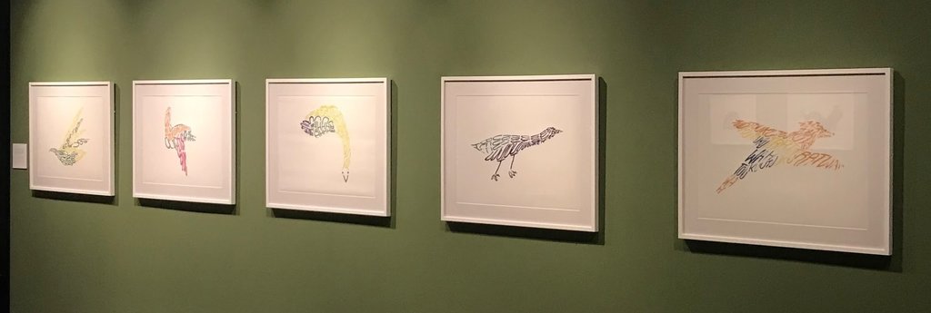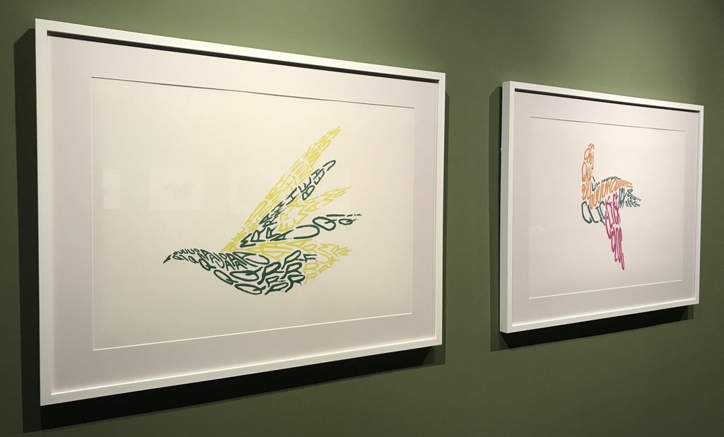 Naufus Ramírez-Figueroa’s Concrete Poem Documentation (2011)and Cantos de Pajaros Extintos Previamente Desconocidos Por la Ciencia, Pero Recuperados Por El Espiritismo, 2 (Songs of Extinct Birds Previously Unknown by Science, but Recovered in Spiritualism, 2) (2015) is a series of five digital prints depicting bird-shaped designs of letters and words, accompanied by an audio piece of a person making bird-like sounds on a loop. The work attempts to commune with long lost animals through the performance of seances. The prints act as translations from these performances, depicting the phonetic sounds of extinct species. Through this spiritual method, the artist has attempted to breathe new life into these extinct birds and give them a chance to be heard again.