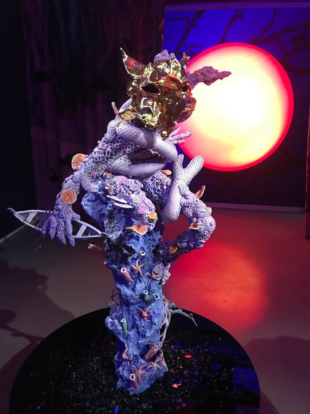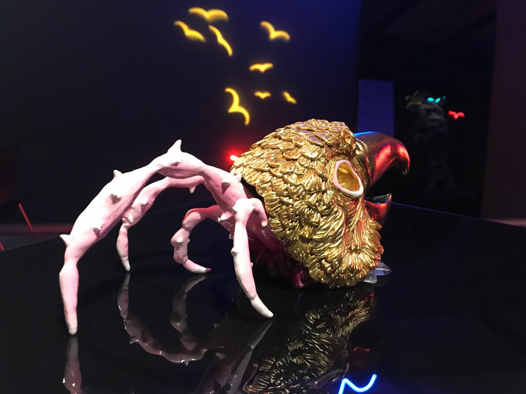 The works by DaveandJenn are the highlight of the exhibition. Their sculptures and installations transport audiences to a fantastical and tropical otherworld of hybrid creatures. They combine the elegance of precious treasures with a parasitic base, creatures that are deformed by the pollution that threatens our seas. These sculptures of imaginary adaptations are aggressive and violent, such as hermit crabs living inside decapitated parrots and sea monsters destroying ships – a real warning to us.
