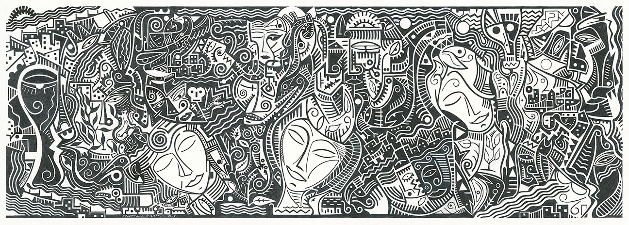 Conversation, 2018, ink, coloured pencil, acrylic, graphite on paper, 21.25 x 56.25 in