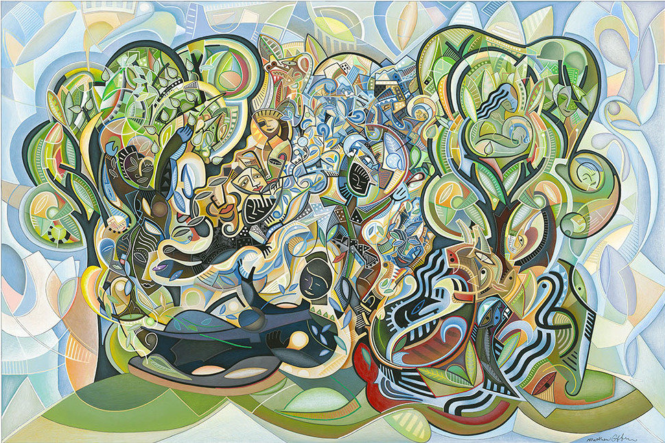 Dream into Life is one of Giffin’s recent paintings. The image works at two scales. From a distance, we see what looks like two large trees surrounding a reclining figure. Up close, we discover an intricate and detailed tapestry of imagery. The world in all its organic complexity seems to be rising out of the figures mind as though created by her thoughts.