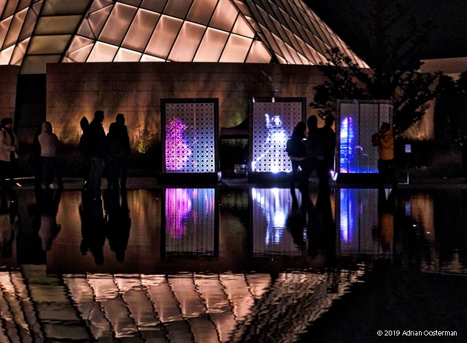 At the south end of the bridge, the translucent glass walls of the Fort York visitor centre were lit from within up by the kaleidoscopic light installation by LeuWebb Projects.