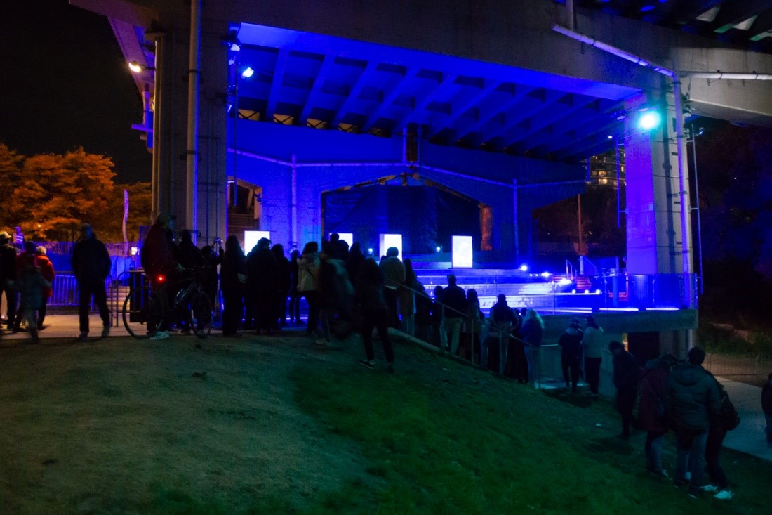 The formerly bleak and empty concrete basilica of the Gardiner Expressway’s underbelly has recently been transformed into and urban park, the Bentway. This place was full of people, art and vendors. At the western end, a video and dance performance by Francesca Chudnoff filled a full bay with deep blue light.