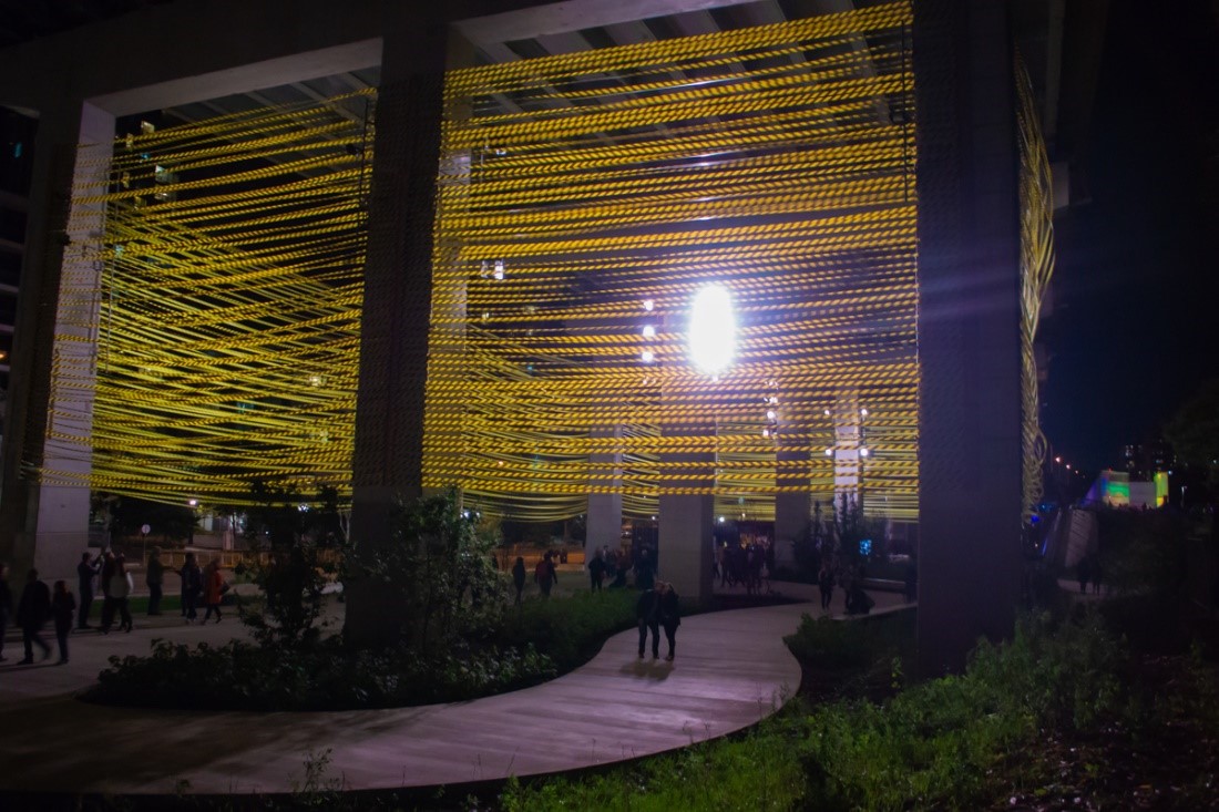 Further east, a vast yellow membrane hung down from above, shimmering in the breeze. As I got closer, I saw that it was a simple construction: many rows of hazard tape wrapped around the columns illuminated from within by powerful lights.
