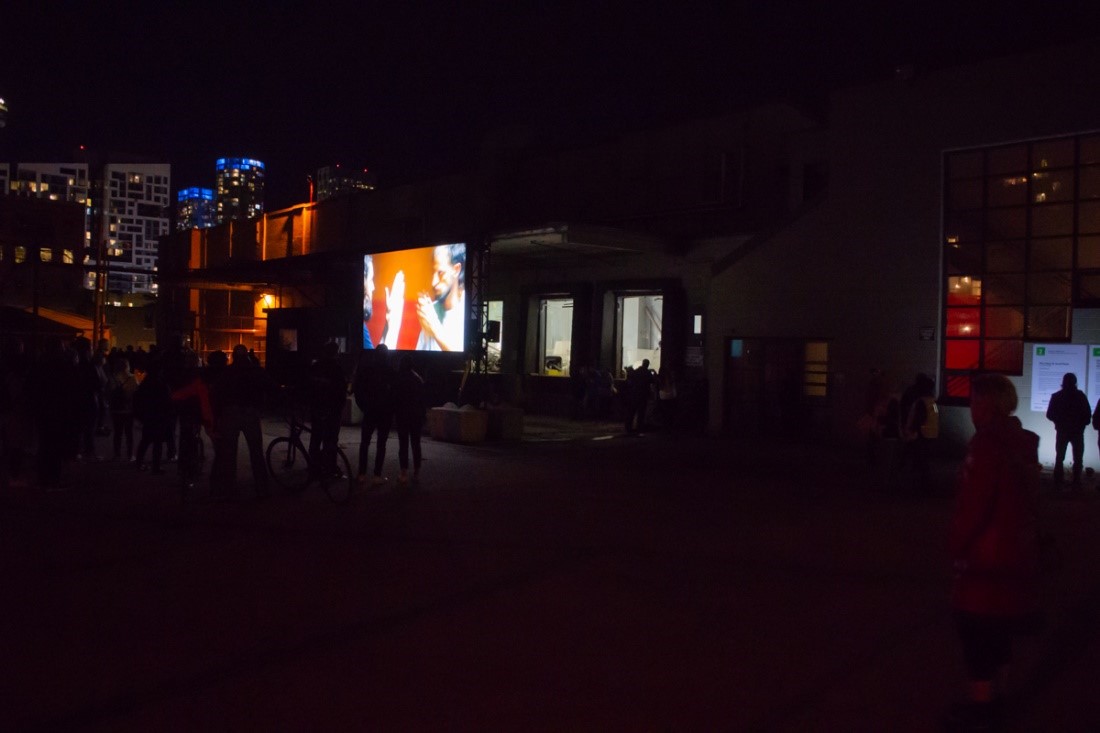Around the corner from Niagara is an empty old abattoir. At the front gate a vigil for the animals that were slaughtered here was held by the activist group ‘Toronto Pig Save’. Past the gates, Kim Morgan and Kaitlyn Bourden had added ghostly, illuminated equipment to the courtyard. Further in, Max Dean and Jared Raab projected their video piece That Moment in front of the illuminated loading docks of the now decaying facility.