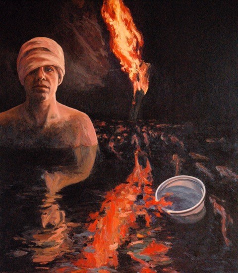 Thirty Years, Thirty Artists, was the theme for his booth at the Art Toronto fair. His September exhibition, 1989 – 2019 featured some of those artists. I asked Robert about the Will Gorlitz painting Bad Faith at the back of the gallery and learned that it was after seeing the work of this artist that he stopped making art. In his estimation, Gorlitz was just too good a painter. Birch had been studying to be a medical illustrator at the University of Toronto, but would hence devote his love of art to its exhibition rather than its making. The Gorlitz painting in the show is enigmatic. A dead-pan self-portrait with the head bandaged had been a recurring theme for the artist at that time. Here he is chest-deep in dark water illuminated by a flaming branch, teeming fish, and a plastic container. I take the figurative elements in Bad Faith to signify a catastrophe of some kind. We can’t know for certain. To me, the loosely wrapped head covering the artist’s right eye point less to a physical wound, than something psychological, and with some detective work the implied drama may reveal itself. The swami-like Gorlitz, reflected into the inky bath as a playing card knave, has given us the clues and it falls to the viewer to ‘unwrap’ a possible scenario.