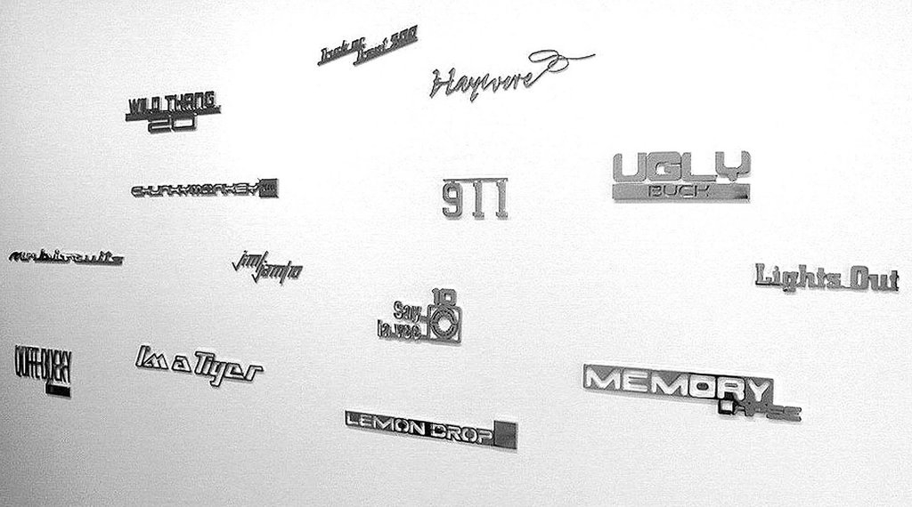If I refer to Louise Noguchi’s chrome plated steel pieces as synthetic, I don’t mean that they are fake. If her Broncos and Bucking Bulls works are funny, it’s a molten humour that she has not had to melt from her own cauldron. Noguchi has developed a working method with a broad thematic reach, a leap frog from one disparate subject to another through a process of synthesis. Her chrome plated steel pieces combine the names of rodeo animals that buck, with the logos of the vehicles that their riders might own. Rendered as gleaming chrome word marks, Chunky Monkey, Haywire, and Say La Vee are fun as gallery art, reflecting their aw-shucks western origins, cornball as the oater wit might be. Her Broncos and Bucking Bulls pieces may seem whimsical at first sight, but what is at work here has more kick than meets the eye. When the indigenous peoples of North America first saw a steam-powered train, they called it an iron horse, a synthesis of the known with the unknown. Ownership and identity are entwined in the trade mark. A ranch brand was seared into the cow’s hindquarters by a red-hot branding iron. When horseless carriages started pouring off the assembly line, the metal logos themselves were bolted into the boots and bonnets of each vehicle. In her art, Noguchi has made the cultural and linguistic threads that link these objects visible again.