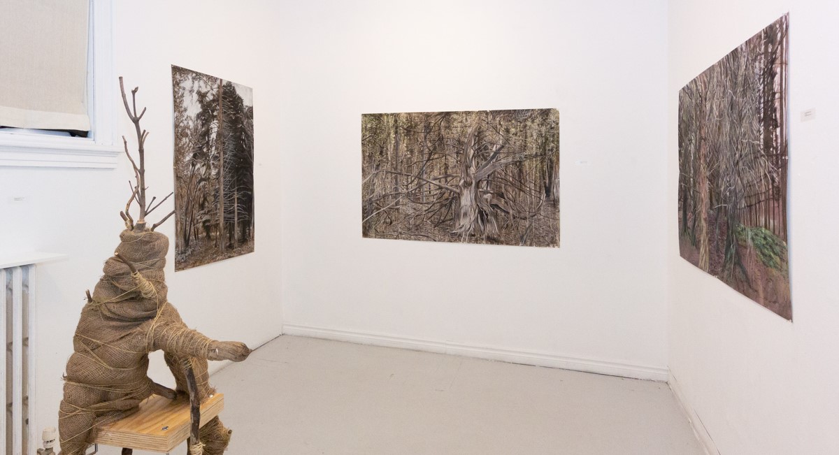 Alcock’s installation asks us to follow the artist in looking very closely at trees. Large drawings adorn the walls of the gallery and a wood and burlap sculptural figure stands on the floor. The drawings are heavily worked with several layers of chalk, charcoal, and subtle hints of colour. In these images, we are in the midst of dense thickets and undergrowth. It’s the kind of forest where we push through branches that reach out to scratch skin and catch clothes. We’re deep inside the forest, only glimpsing fragments of sky while dense vegetation limits our vision to foreground details.