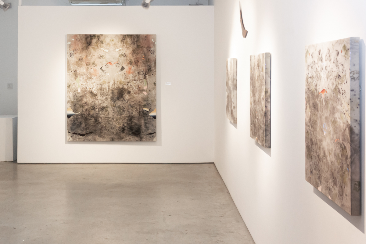 Installation view with Gillian King, Cecropia, 2019, acrylic and various plant materials on canvas, 72″ x 60″ (facing). Photo: Mikael Sandblom