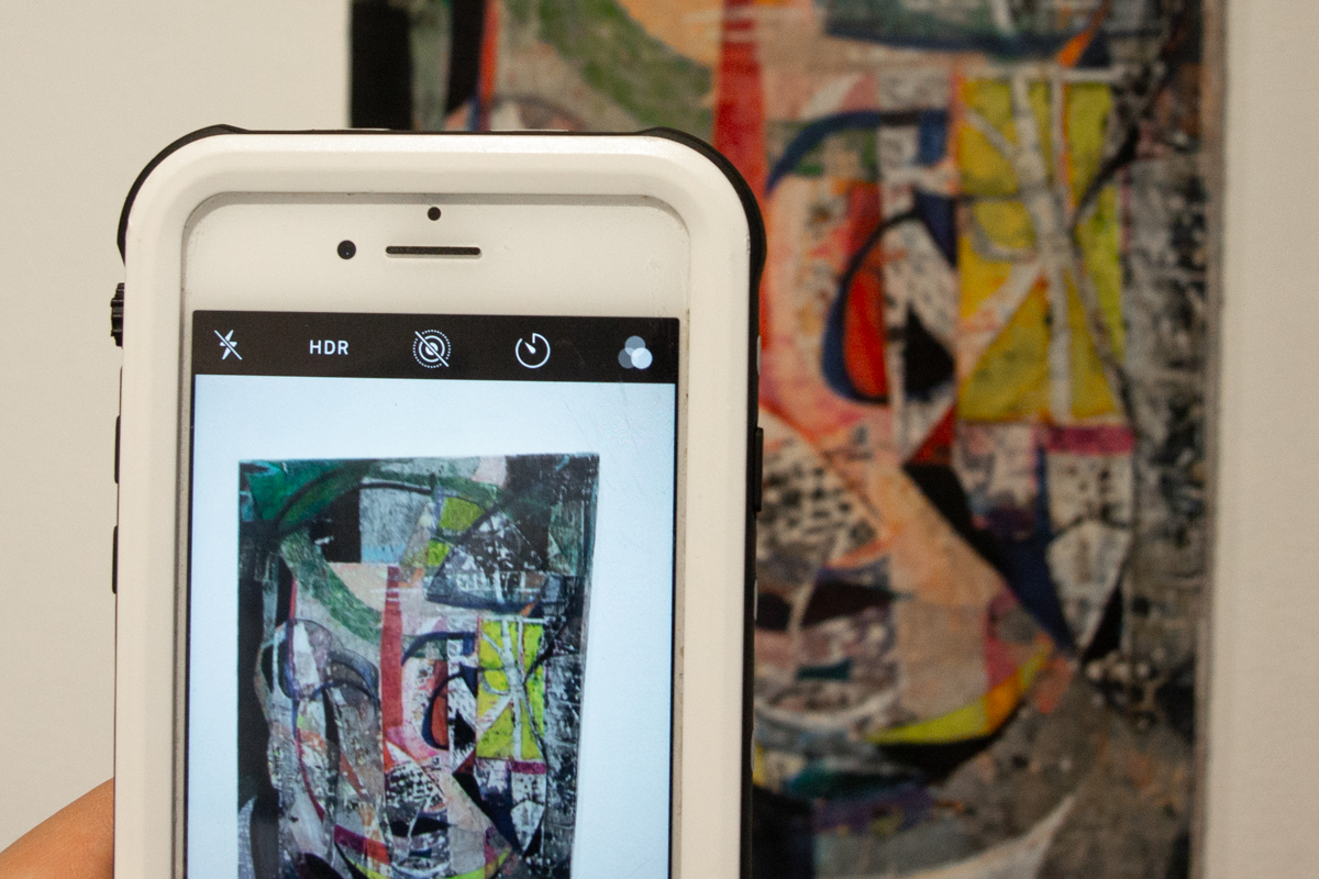 The paintings are dense, rich, and layered. Strata of paint and collage partially reveal the process of how they were made. The pictures bridge abstraction and figuration. In some pieces you can see arms and legs or parts of faces; in others it’s hard to see any particular subject. I found myself switching between trying to decipher the content and enjoying the lush surfaces of the work