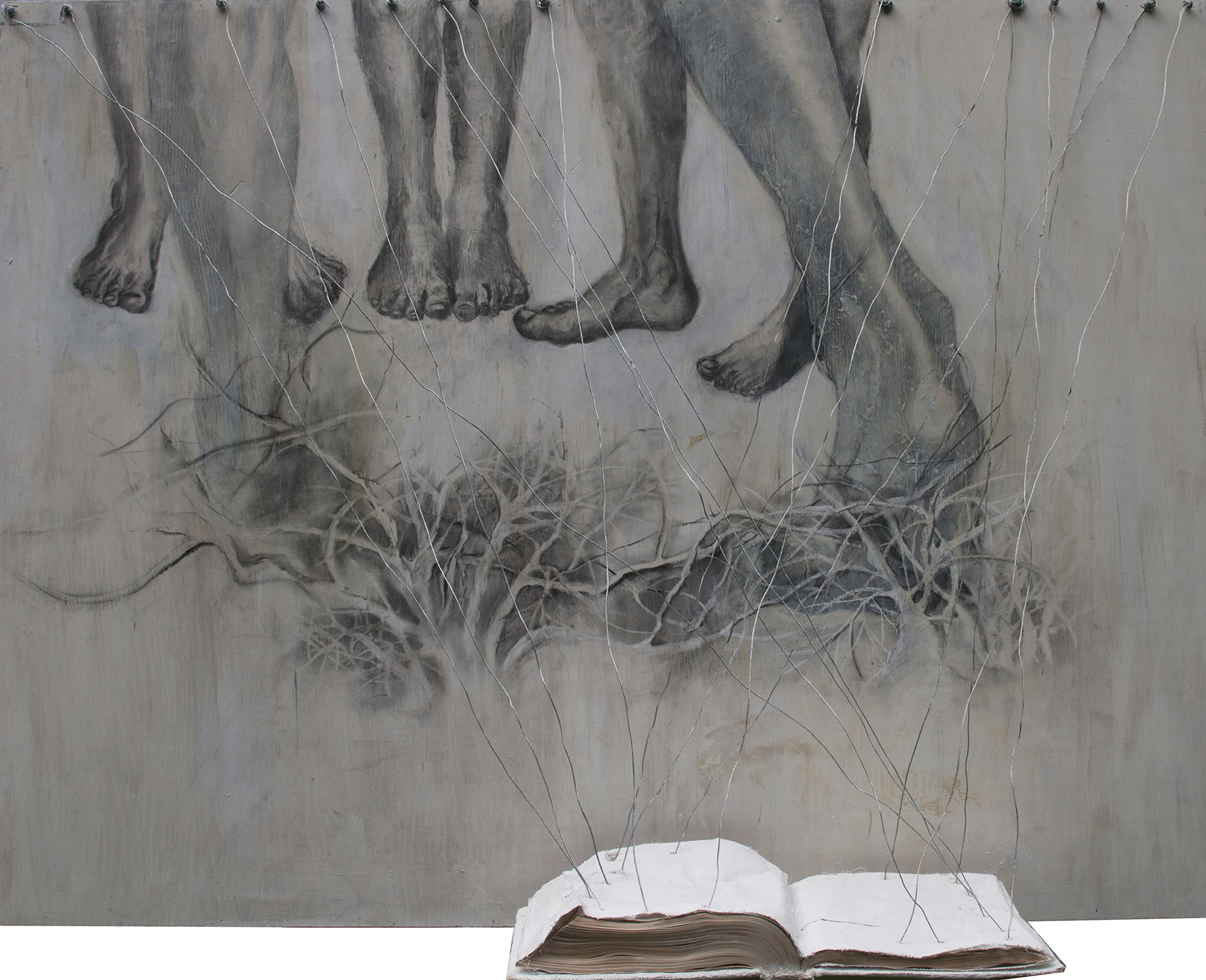 Pnina Dinkin, Change is needed in construct of His-story, 2019, charcoal on plywood, gel medium, wire, book, plaster, 36″ x 48″