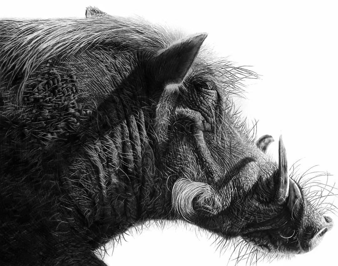 Lisandro Pena, Warthog, 2018, pencil and carbon, 11″ x 14″