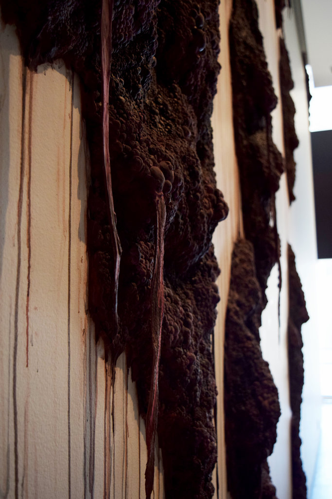 Last but certainly not least is Magdolene Dykstra’s Polyanthroponemia, a comparison of human civilization and microbiology. Akin to viruses and other forms of parasitic microbes, human expansionism is essentially an infestation of the planet whereby resources are exceedingly harvested at the expense of Earth’s own well-being. In order to illustrate this concept, Dykstra fixes large growths of clay to the space’s walls and entrance to emulate festering microbial life that subsequently expand over the course of the exhibition.