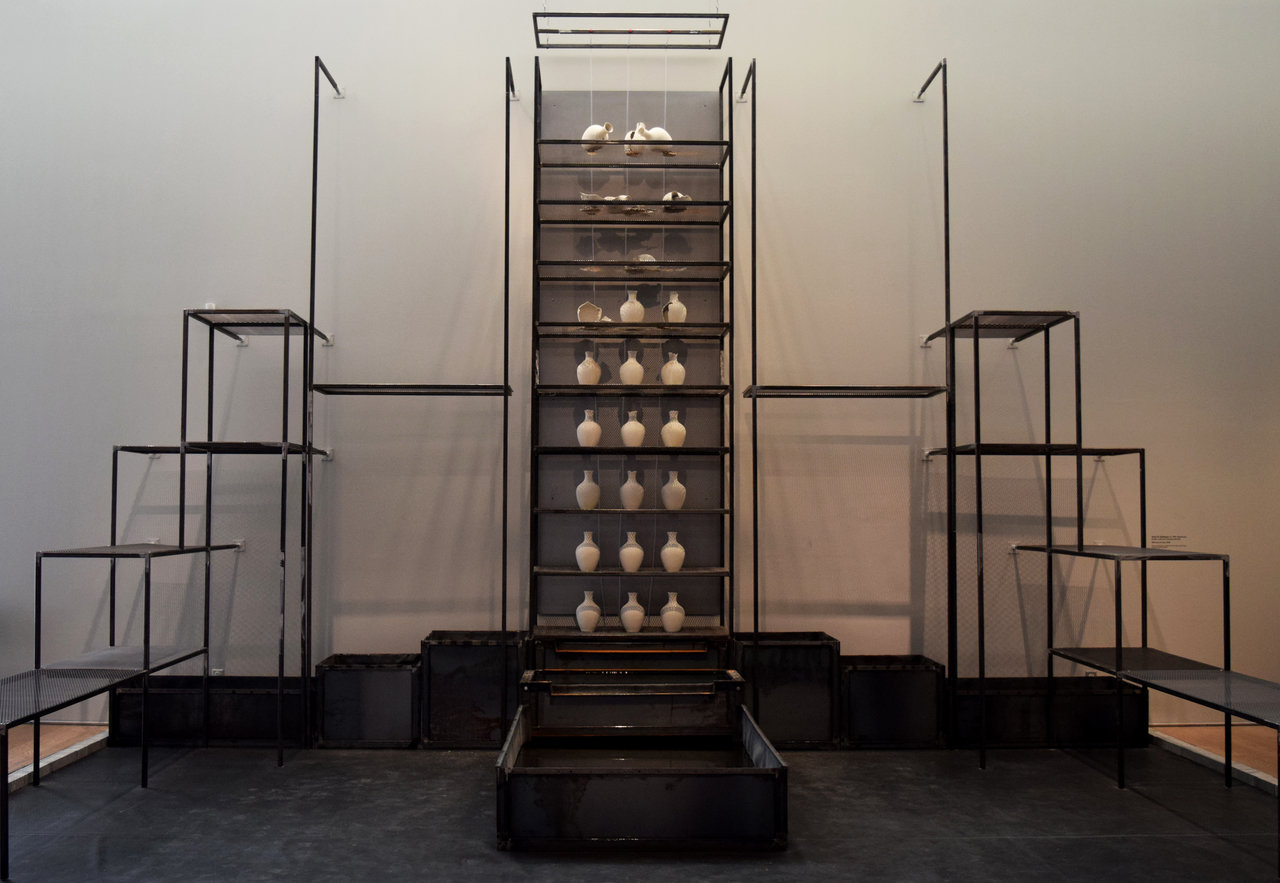 No less monumental is Azza El Siddique’s Measure of one, a colossal installation combining clay, metalcraft, and water to illustrate the progression of time and its effect on human history. Modelled after an Egyptian temple erected for the 7th century BCE Nubian pharaoh, Tirhaga (Taharqa), the structure consists of a large central tower, flanked by shelved transepts and overlooking a small cistern. The central tower holds rows upon rows of unfired urns. Water is then pumped up from the reservoir below and allowed to drip on and deteriorate the works. As more time passes and the urns lose their integrity, they are shifted to the transepts for viewing and are likewise replaced by new urns to similarly erode. This brings to question our notions of memory and loss, which applies beyond institutionalized studies of history to include personal notions of our individual and collective pasts.