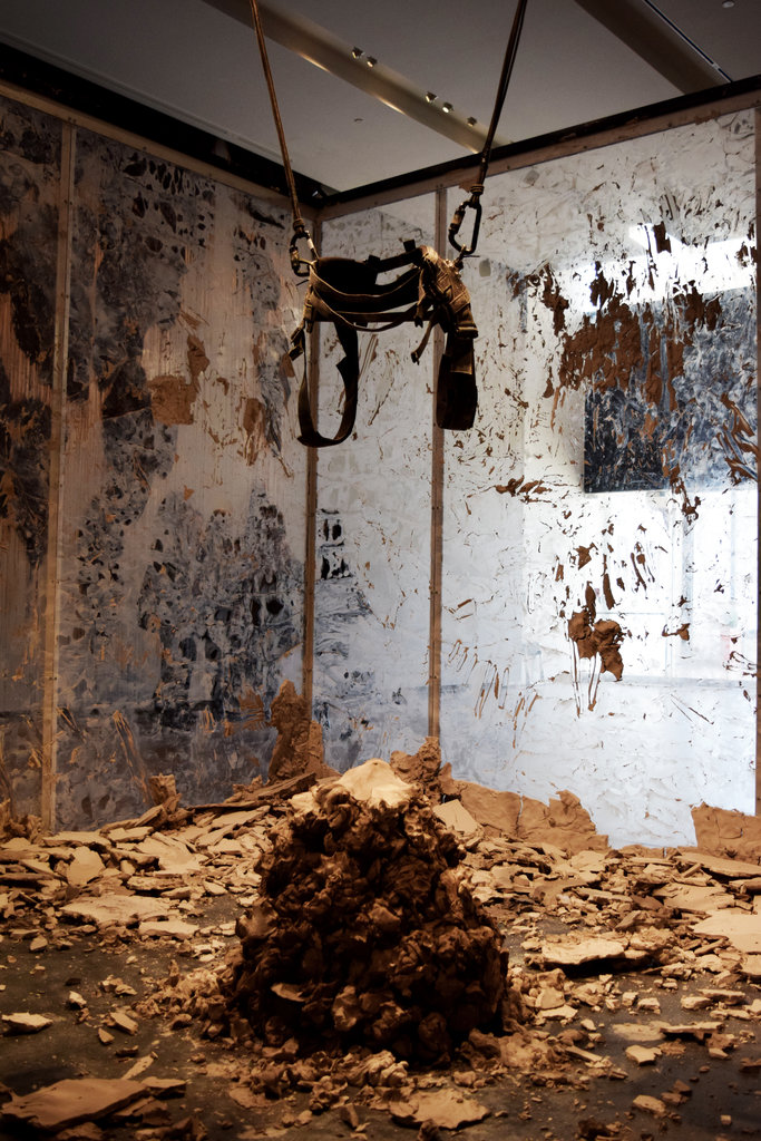 The performance itself was a defiant display of raw physicality and determination. It was commemorating Carolee Schneemann’s Up to And Including Her Limits (1971-1976) and reimagining it to encourage visibility on transgender and non-binary identities, particularly in the face of ongoing violence and disenfranchisement towards those communities. Now, its remnants include video documentation of the performance, the crumbled walls of the dry clay, and Cassil’s pedestal and harness that serve as a monument to their message.
