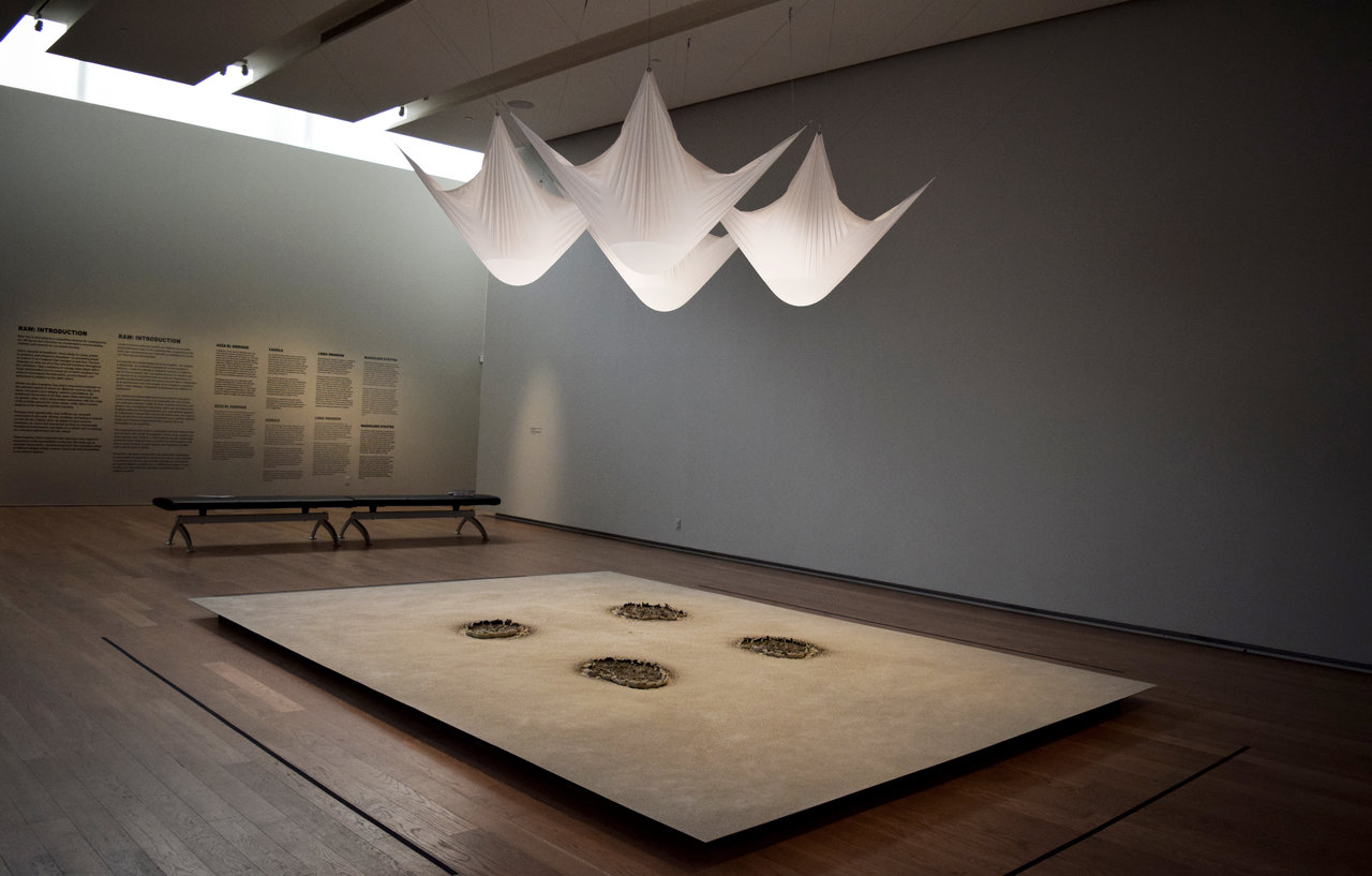 Continuing with the theme of water and transformation, Linda Swanson presents her TEMPLUM OF A PRECIOUS THING OF NO VALUE, A SHAPELESS THING OF MANY SHAPES. It consists of bentonite clay dust delicately sifted onto a flat base. Overhead are four water-filled membranes that gradually trickle water onto the loose surface, essentially creating a topographic display of ongoing development. It is impossible to determine when the drops will fall, how they will impact the surface, and what the outcome will be; all that is known is that it will change over time. Just as the clay will transition over time, so too are we, the audience, invited to consider the cosmic order of things: how events beyond our control, glanced upon by our microscopic place in the universe, impact our future.