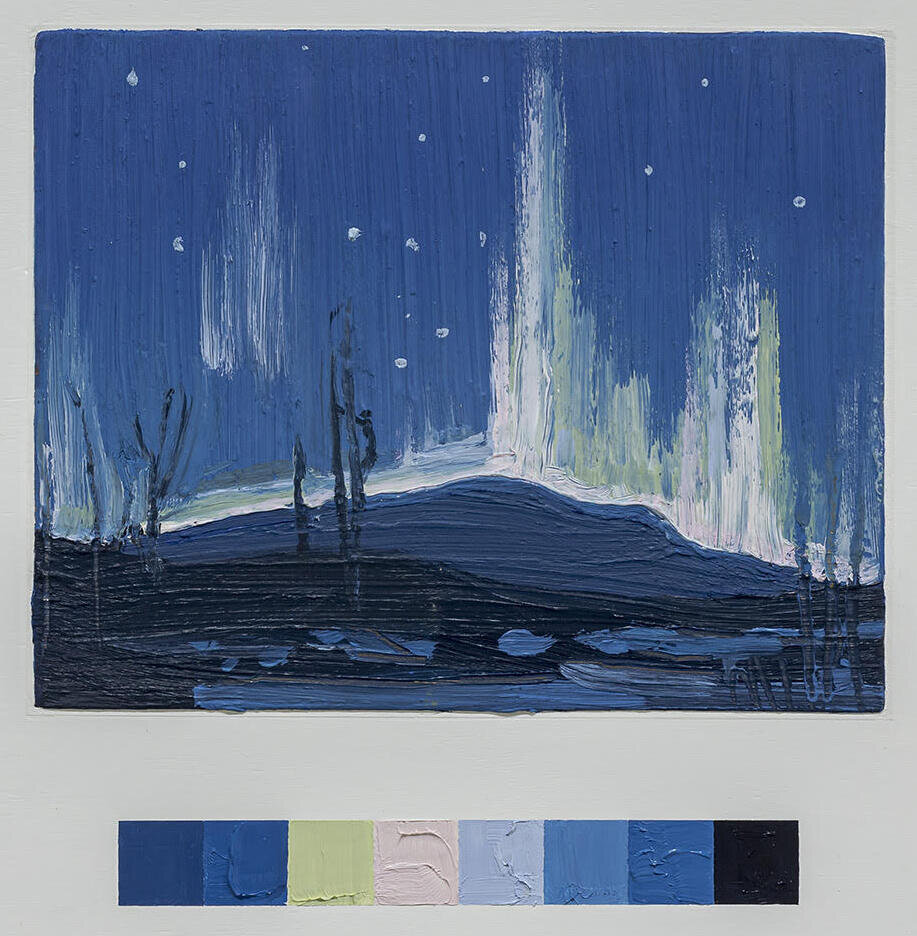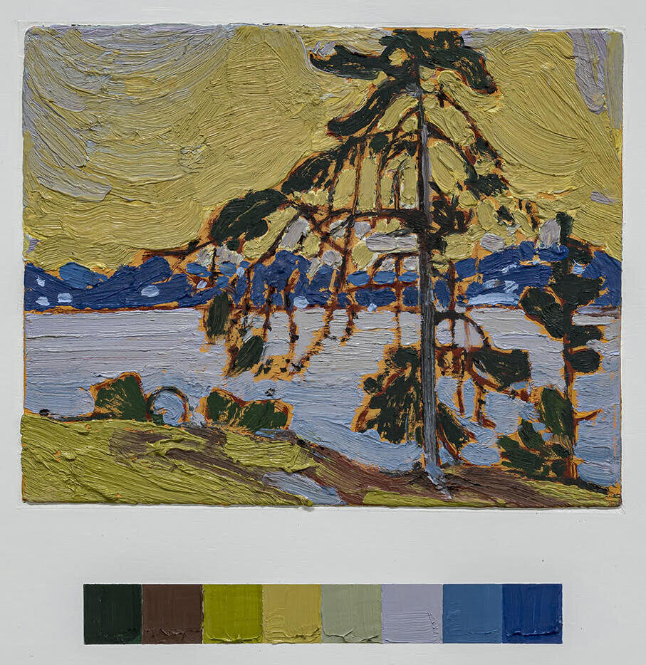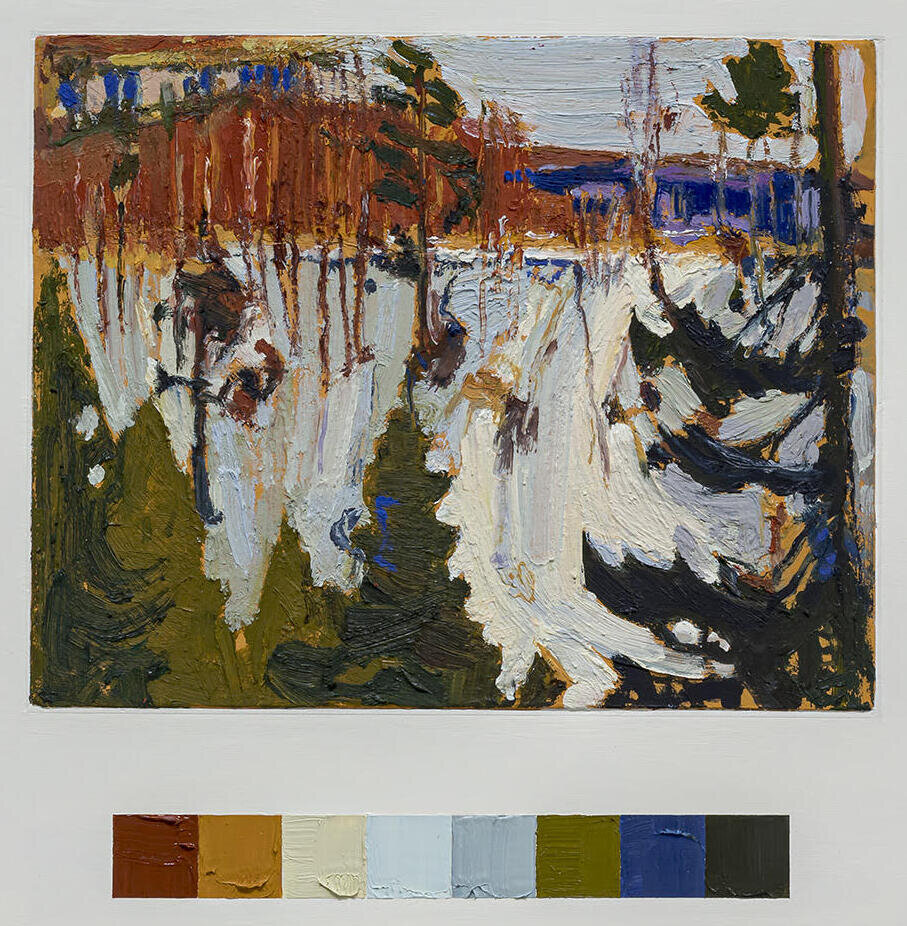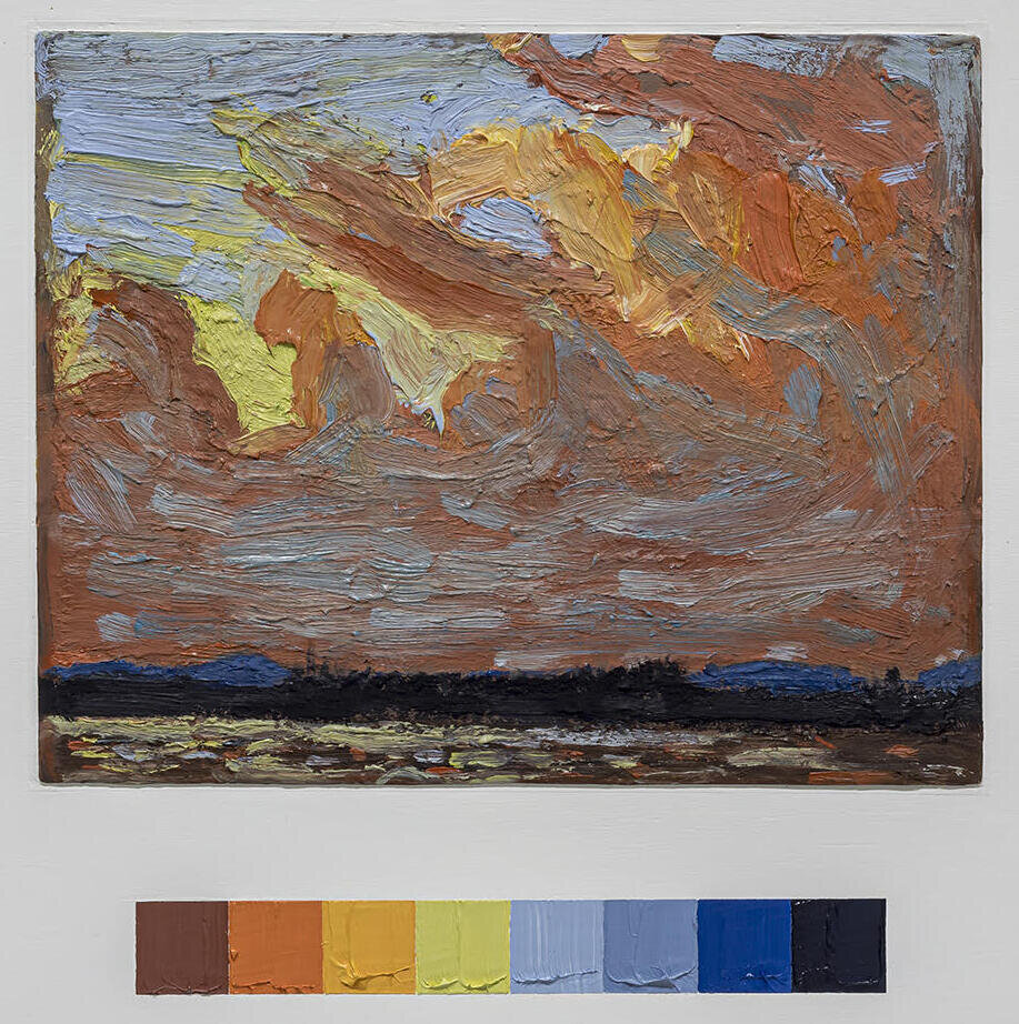 Ben Walmsley captures the pleasure of landscape painting at his POLYCHROME 2020 exhibition at Birch Contemporary. All is not as it seems, however. The seemingly rapid execution of a selection of Tom Thomson oil sketches, upon closer examination, reveal a methodical, patiently laborious process. That a rigorous analysis of Thomson’s work has gone into Walmsley’s exhibition is evidenced by the colour bar below each work, much the way a bar in musical notation measures segments of time to specific beats and particular value. In this respect, the exhibition is a performance of a suite of visual études. Yet, how could something so obviously studied have been made to look spontaneous?