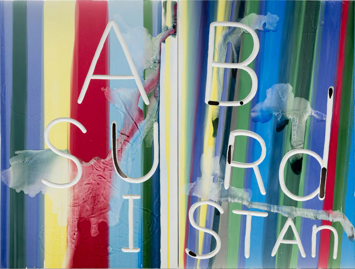 Absurdistan is a painting where the text is more prominent. It’s comprised of two attached panels with bright stripes of colour. On the left panel, the stripes are vertical and on right they tilt away at a slight angle. While wet, the paint has been disturbed to create ghostly organic shapes. Into the bright, slick surfaces, letters have been carved. It’s a rag-tag collection, a mixture of upper and lower cases in various sizes. It could be read as ABSURdISTAn but also A SU I B Rd STANn. To me the painting suggests that in the face of absurdity, you can still find beauty, and humour.