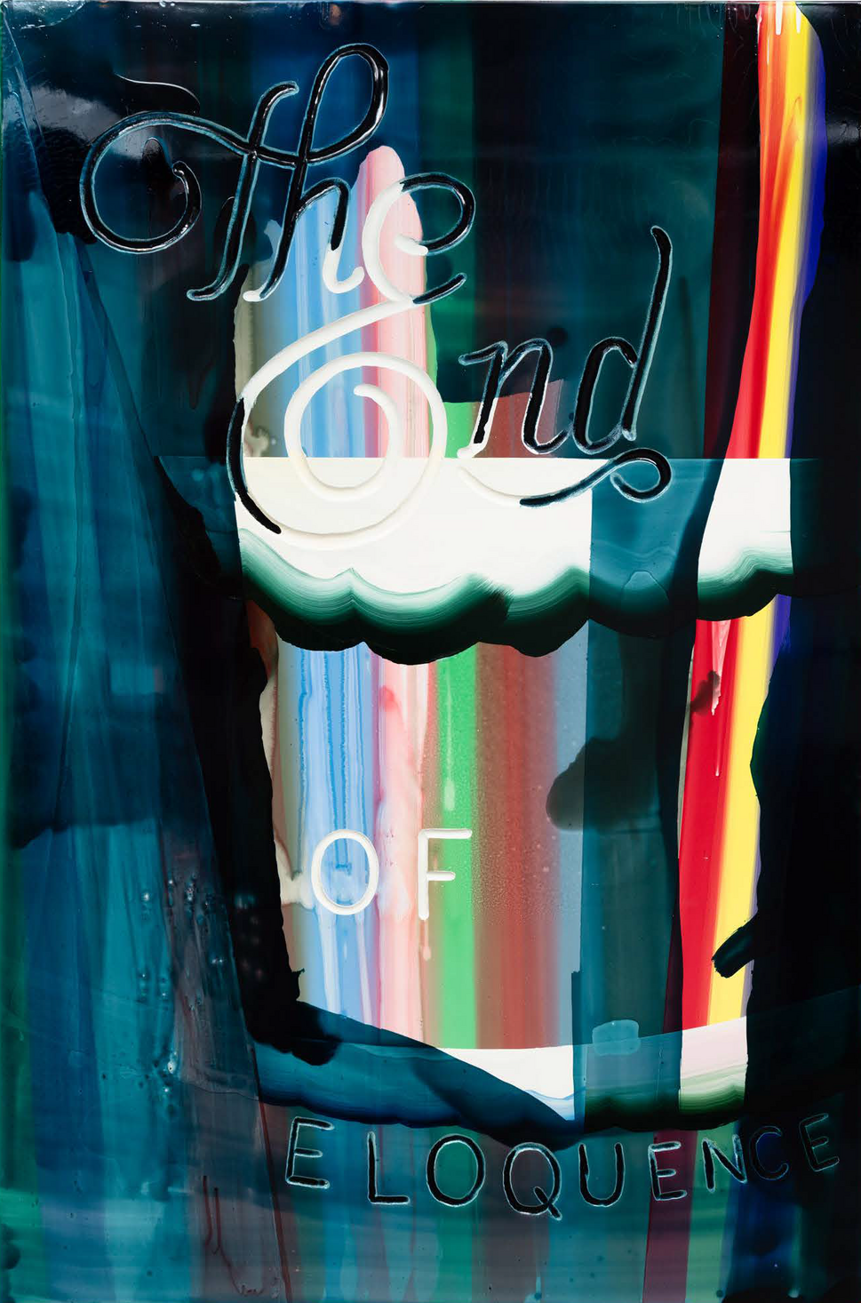 The text that has been inscribed appears in three different styles. The scrolled ‘The End’ looks like the closing scene of an old movie. The ‘OF’ is simple and minimal while the ‘ELOQUENCE’ word looks like printed handwriting. It’s as though three different voices are speaking.